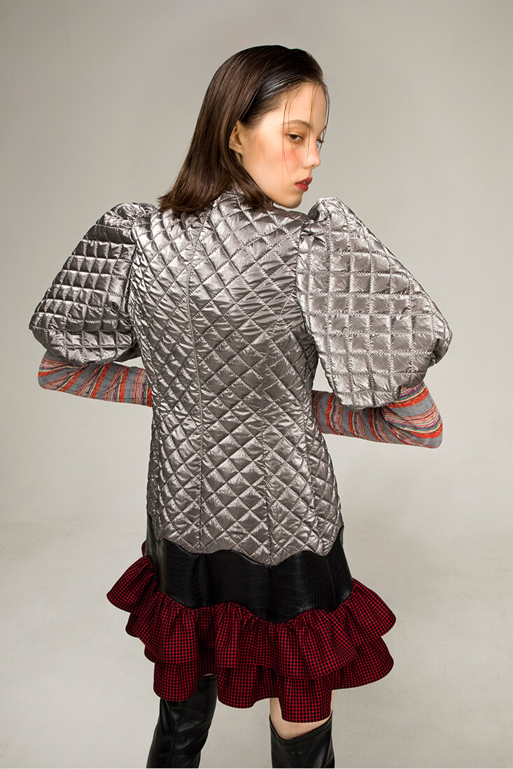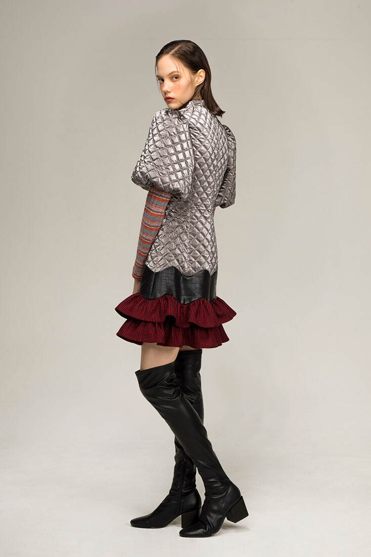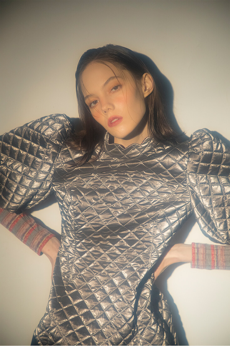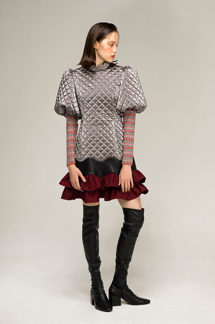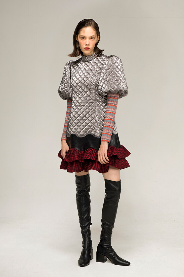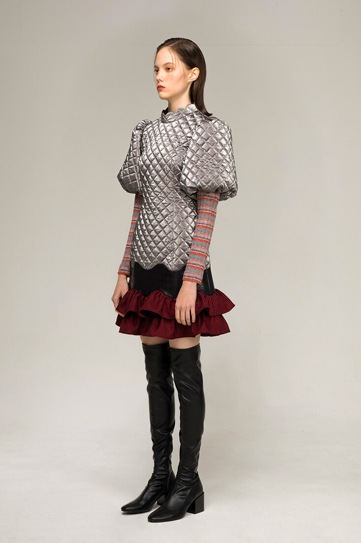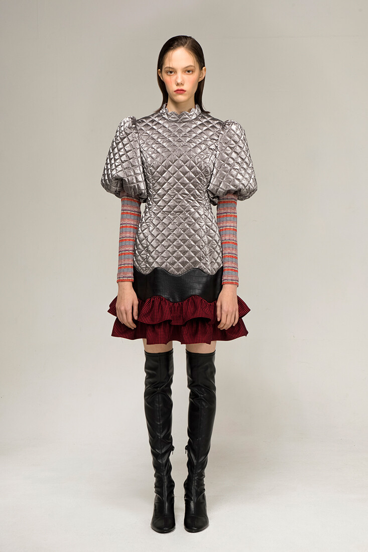 강인한 기사 느낌을 주는 실버 패딩을 사용한 귀여운 퍼프 슬리브와 로맨틱한 러플 스커트로 이루어진 디자인입니다.