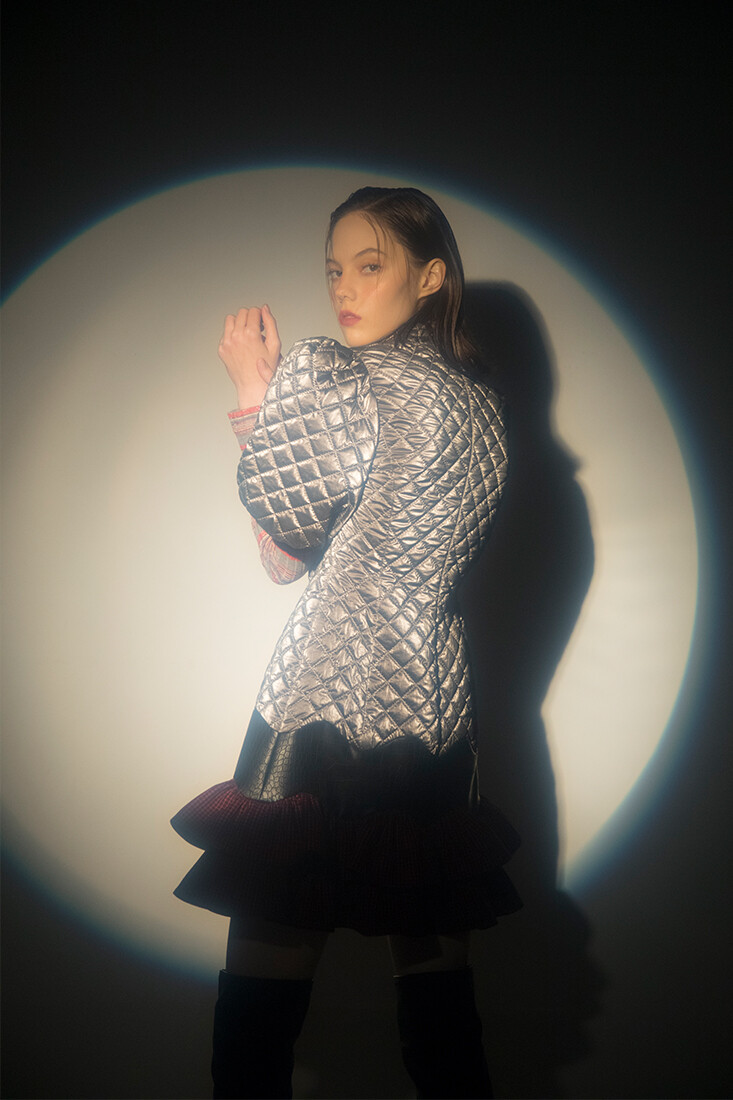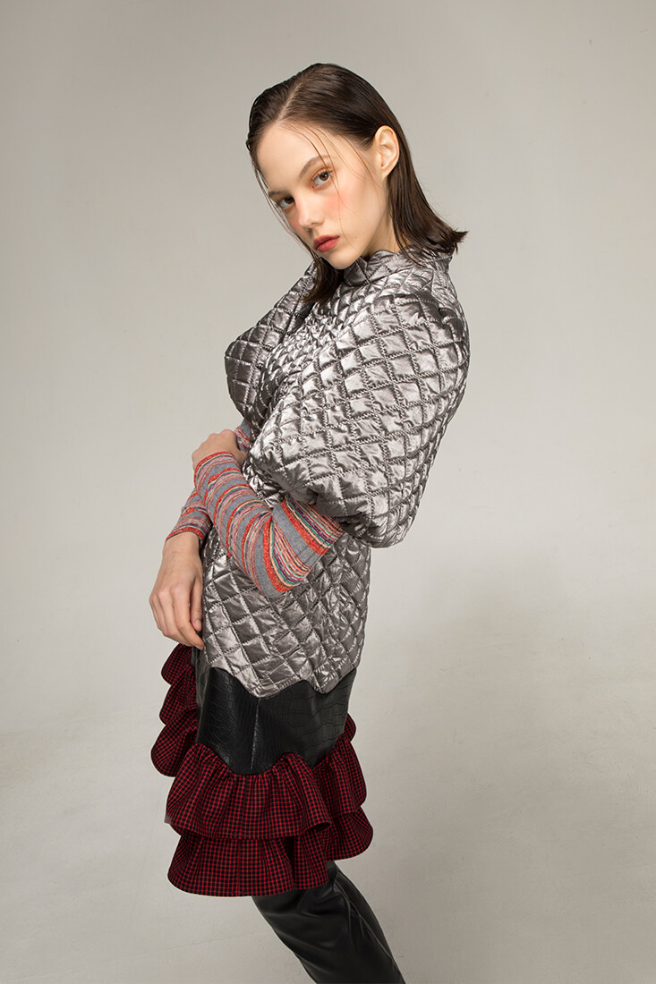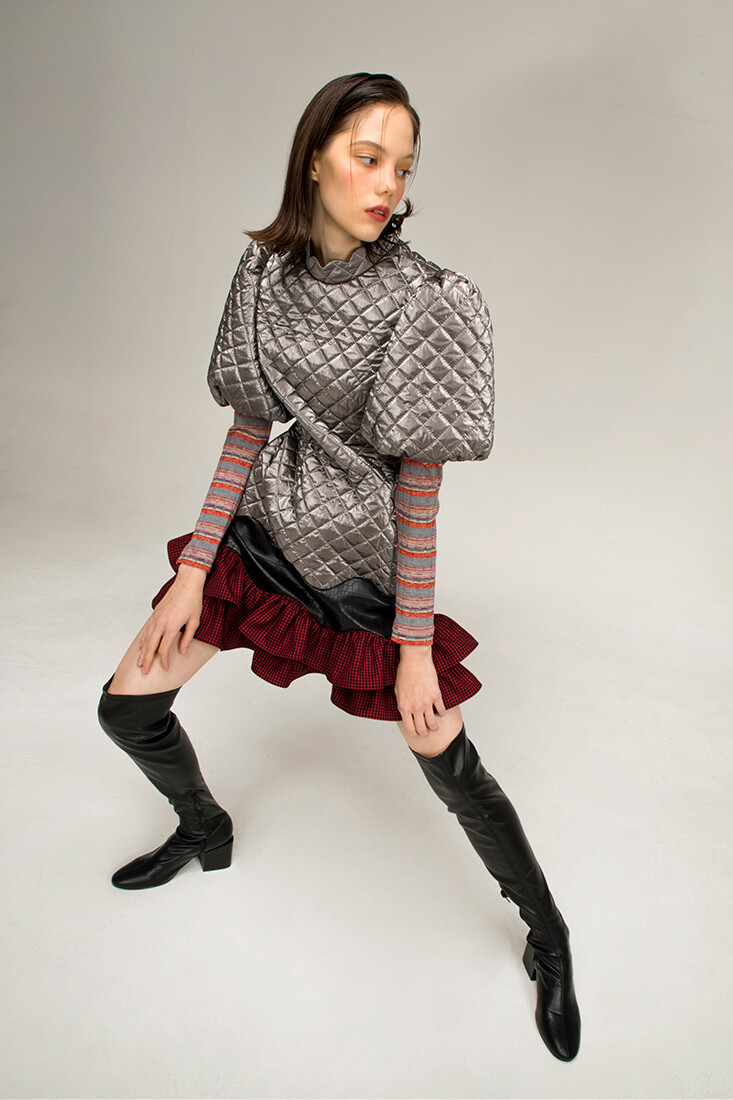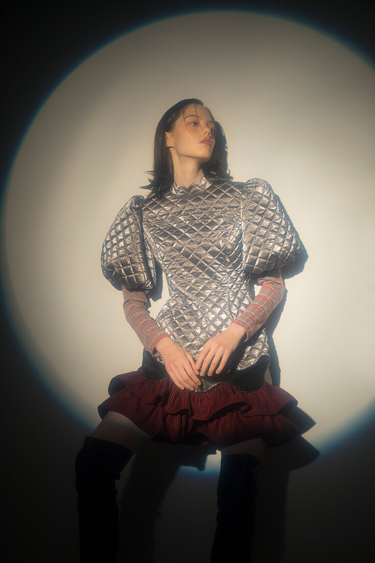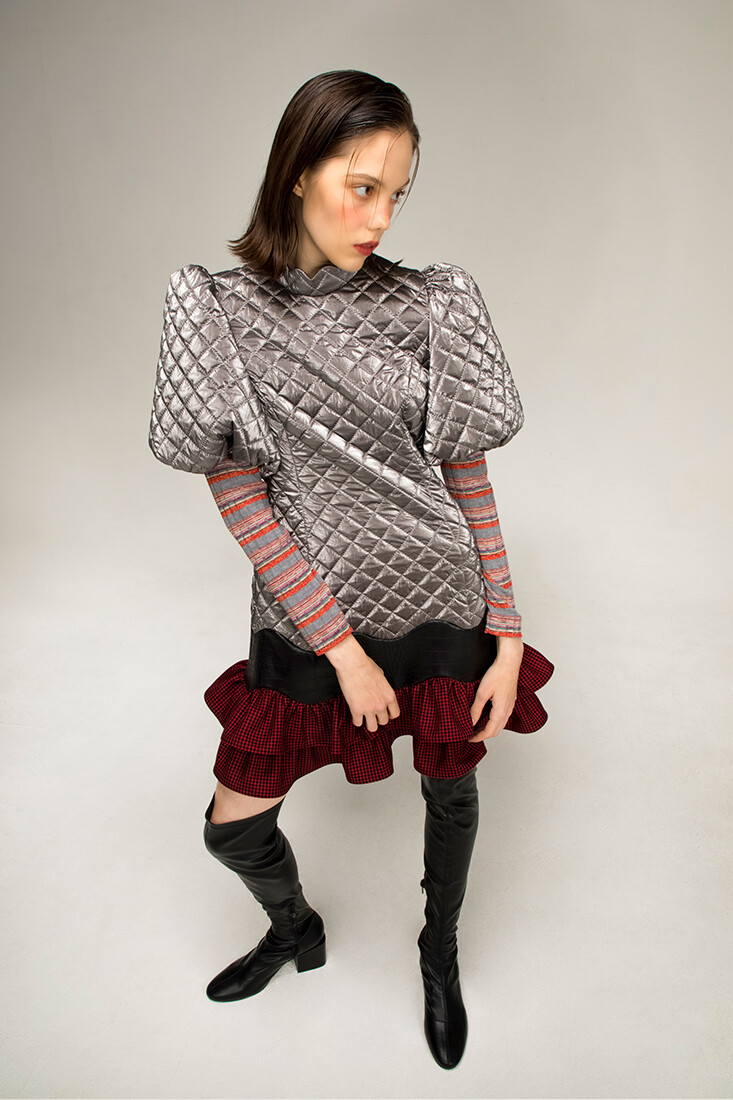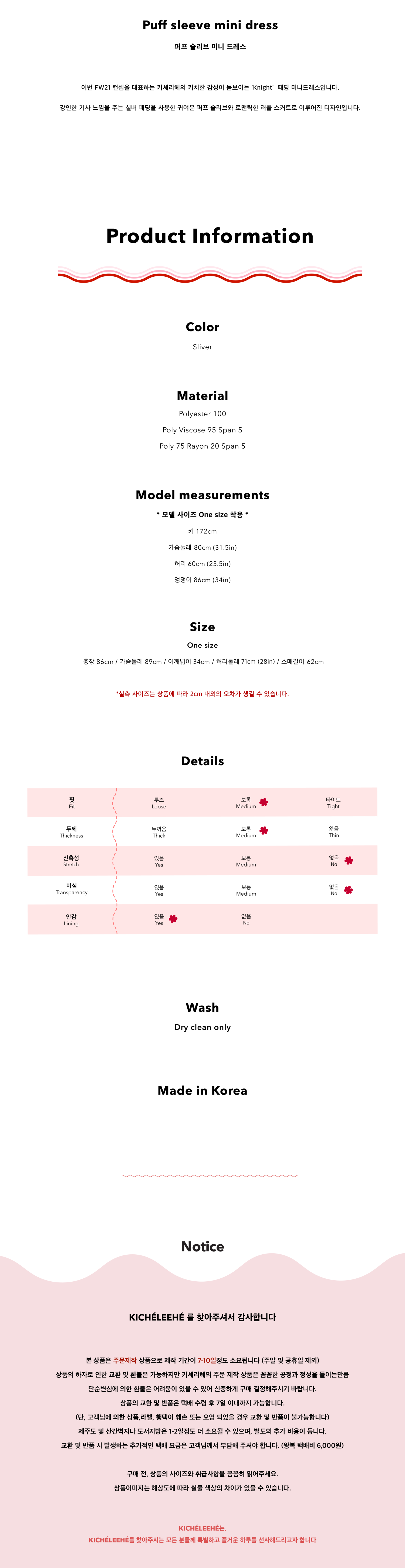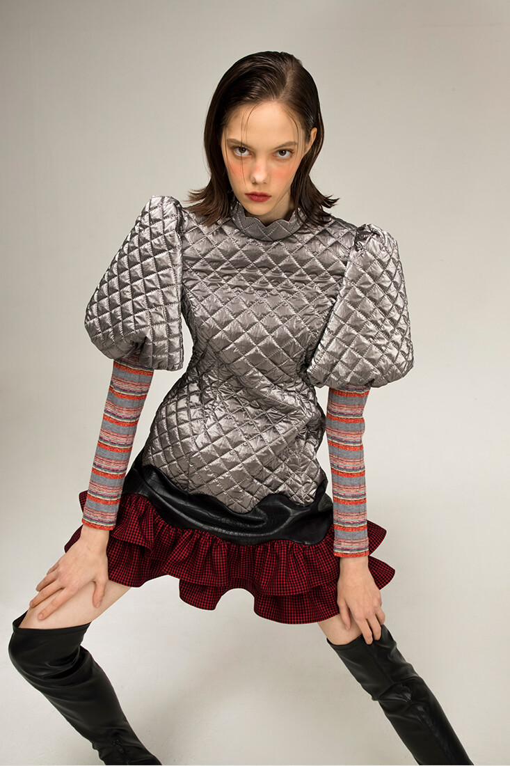 강인한 기사 느낌을 주는 실버 패딩을 사용한 귀여운 퍼프 슬리브와 로맨틱한 러플 스커트로 이루어진 디자인입니다.