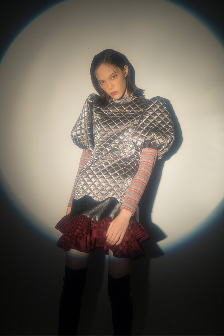 이번 FW21 컨셉을 대표하는 키셰리헤의 키치한 감성이 돋보이는 'Knight' 패딩 미니드레스입니다.
