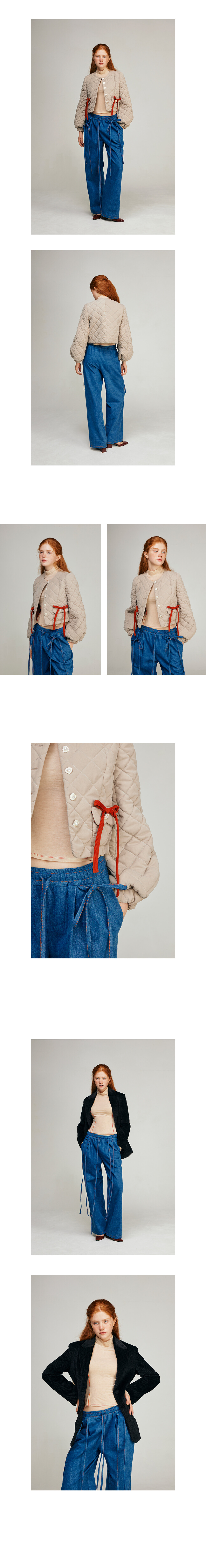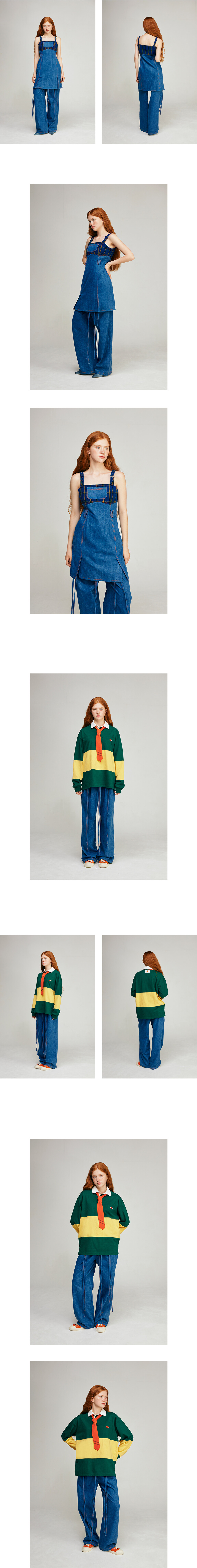 트렌디한 느낌의 턱 디자인의 팬츠 디자인으로, 턱 사이에 길게 늘어뜨러진 멋스러운 데님 스트링이 포인트입니다.