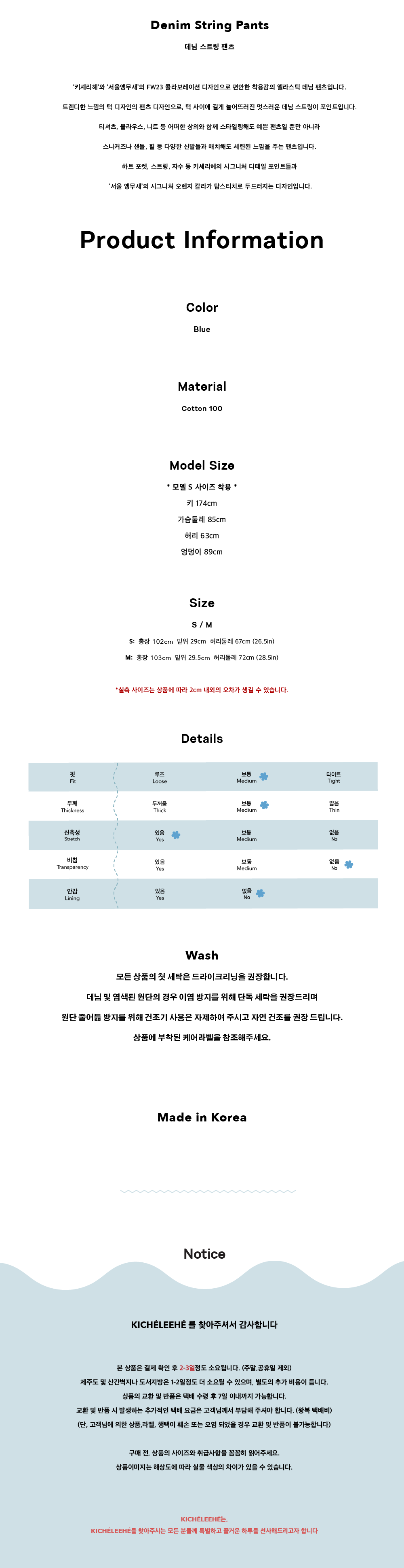‘키셰리헤’와 ‘서울앵무새’의 FW23 콜라보레이션 디자인으로 편안한 착용감의 엘라스틱 데님 팬츠입니다.