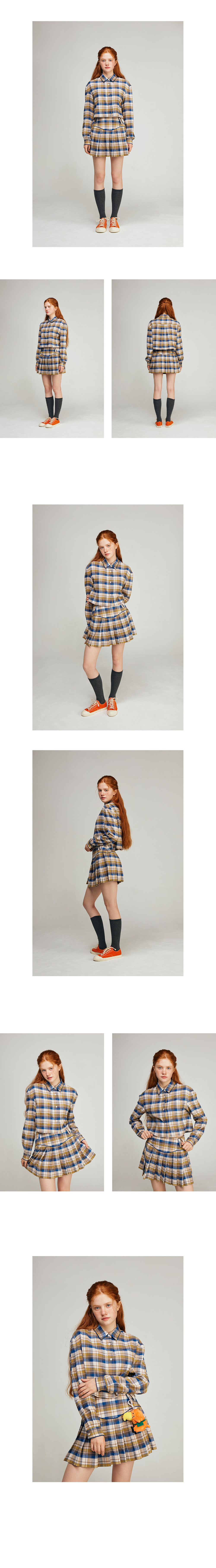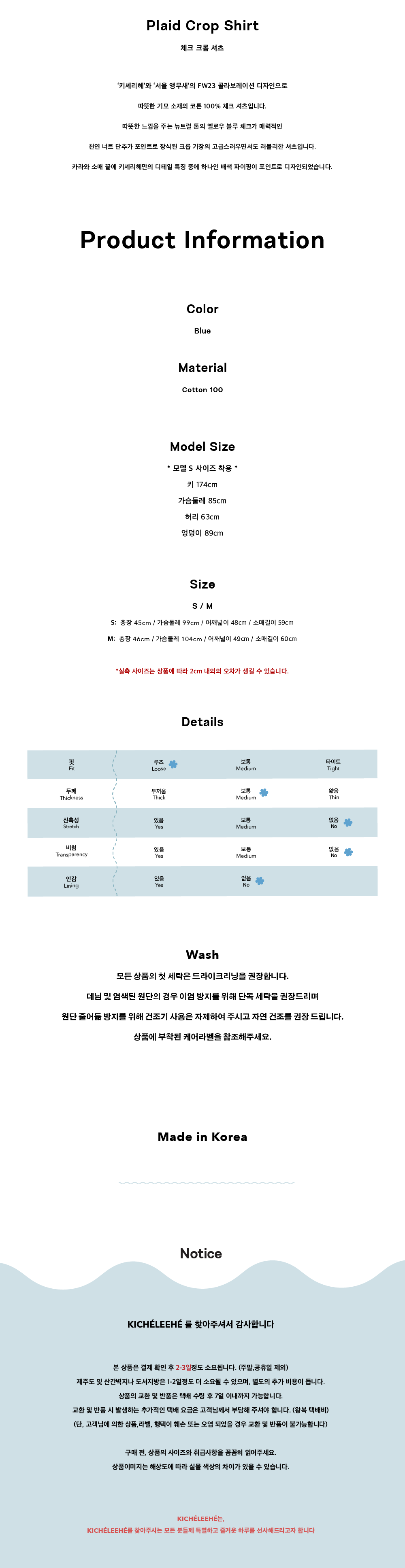 따뜻한 느낌을 주는 뉴트럴 톤의 옐로우 블루 체크가 매력적인 천연 너트 단추가 포인트로 장식된 크롭 기장의 고급스러우면서도 러블리한 셔츠입니다.
