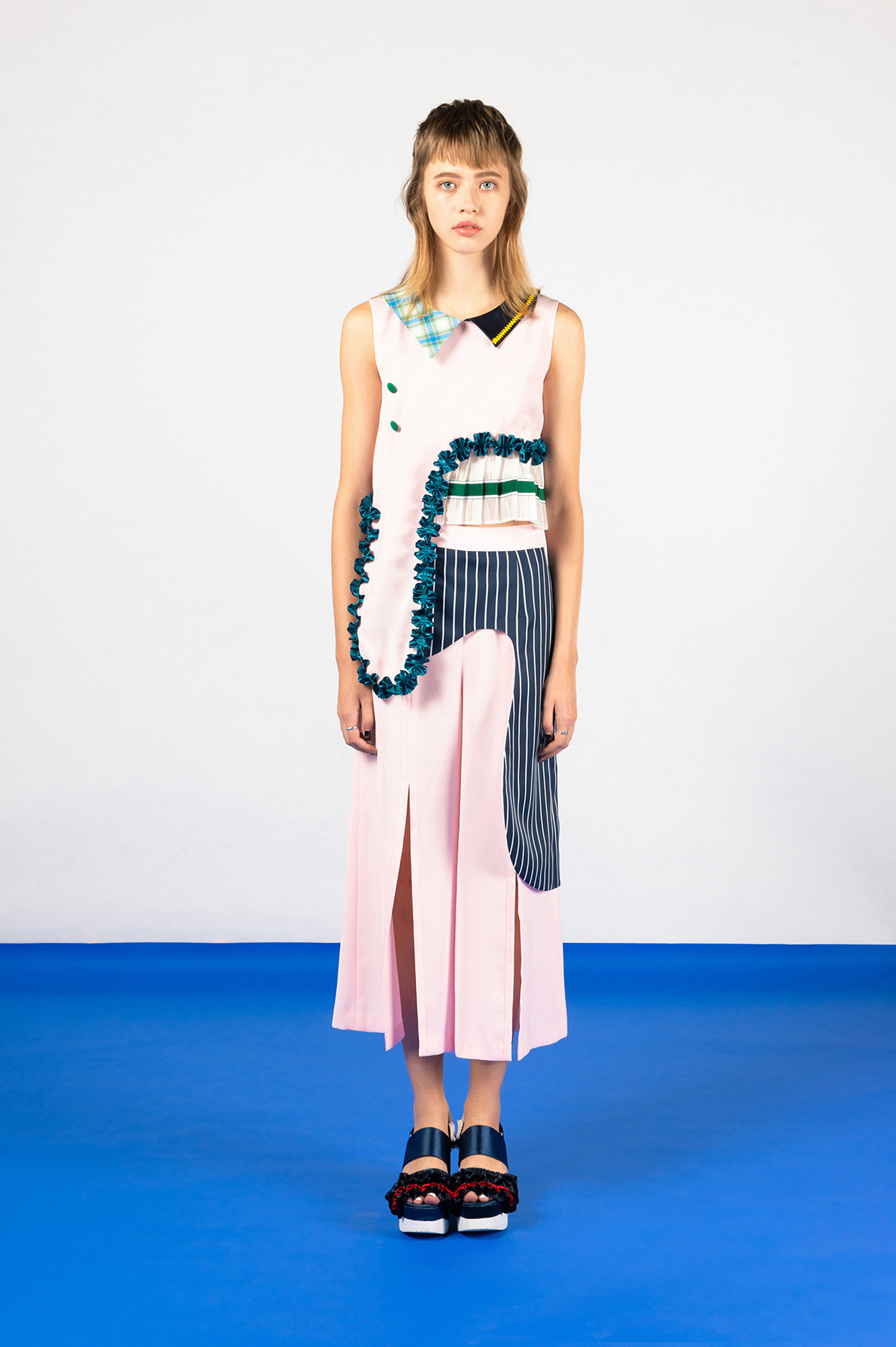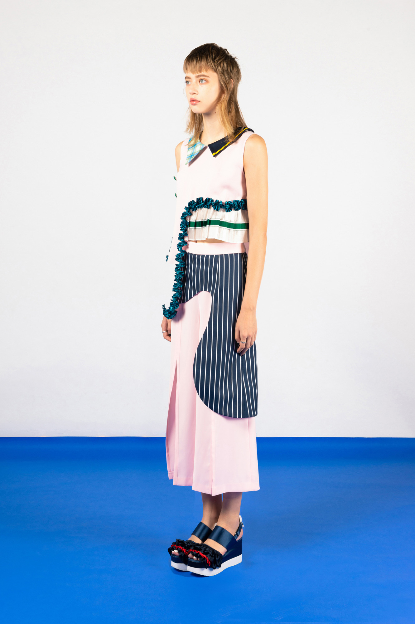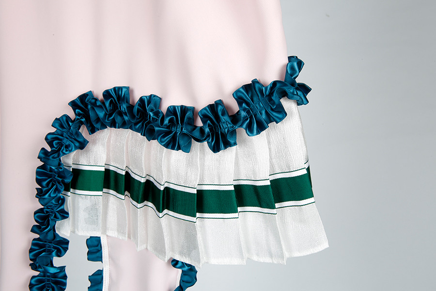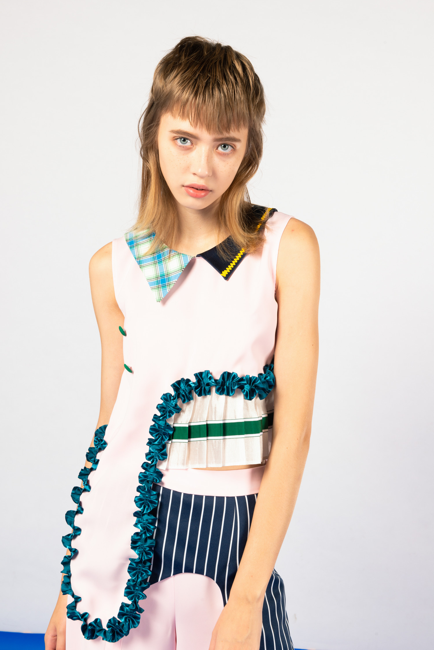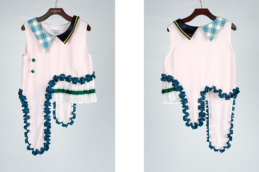 재미있는 러플 장식과 상의 한쪽 밑단이 플리츠와 연결이 되어 유니크한 스타일을 연출합니다.