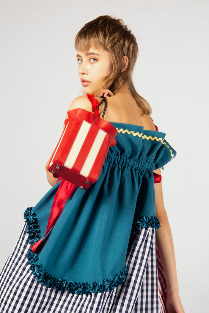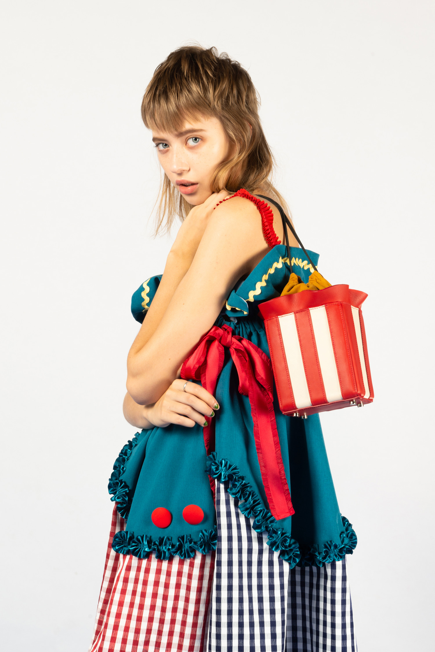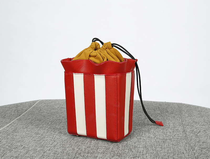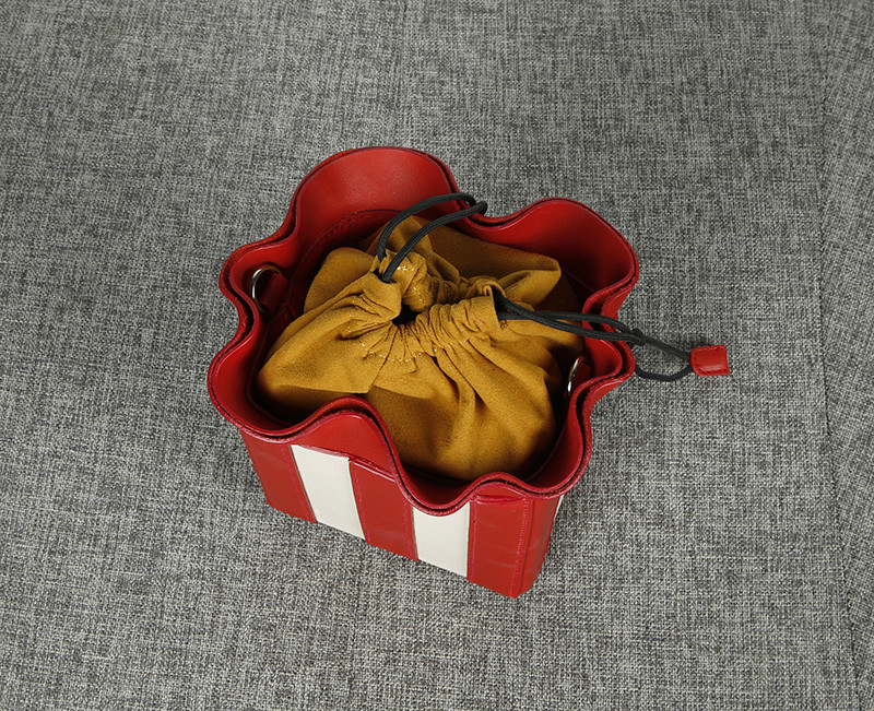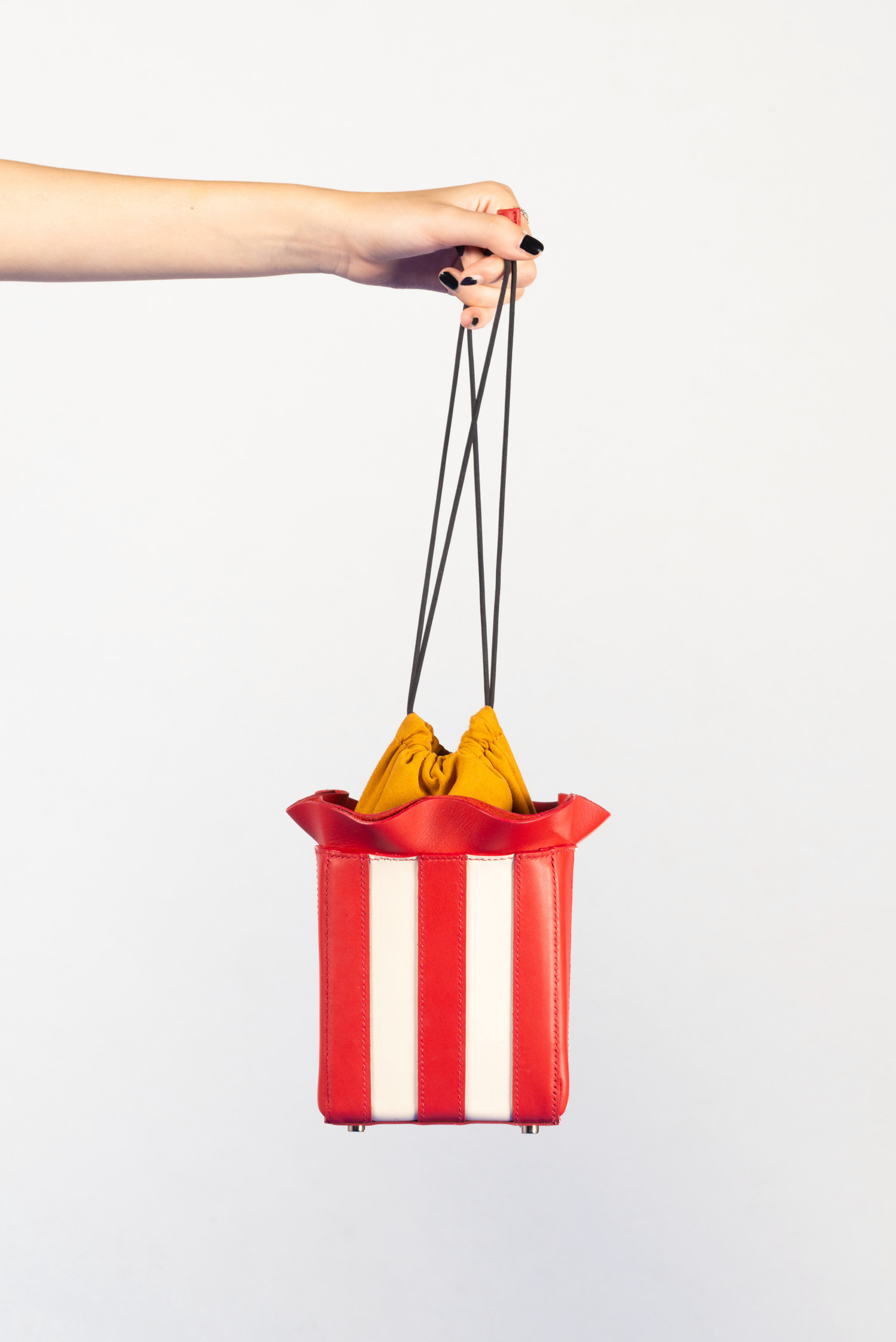 팝콘 박스에서 영감을 받은 디자인에 가죽 프릴 장식으로 재미를 더한 가방입니다.