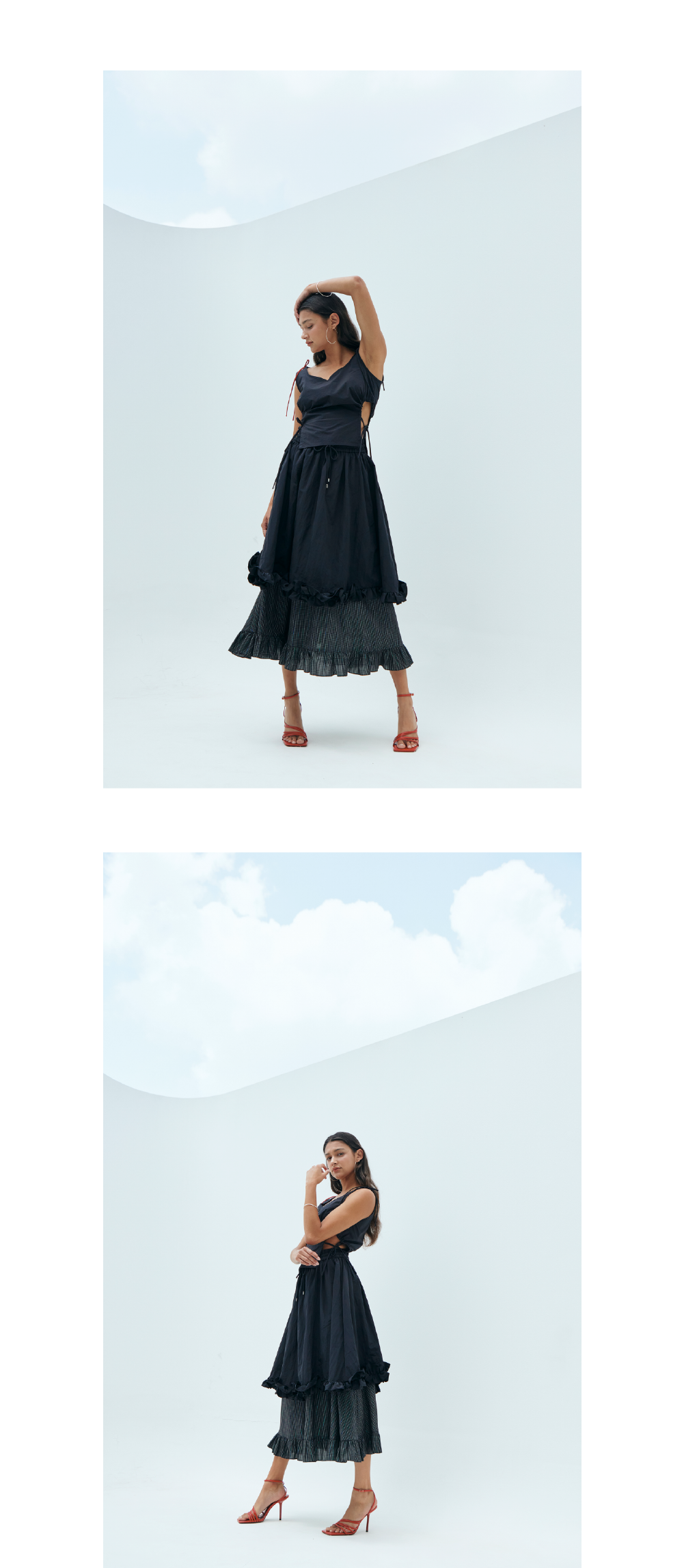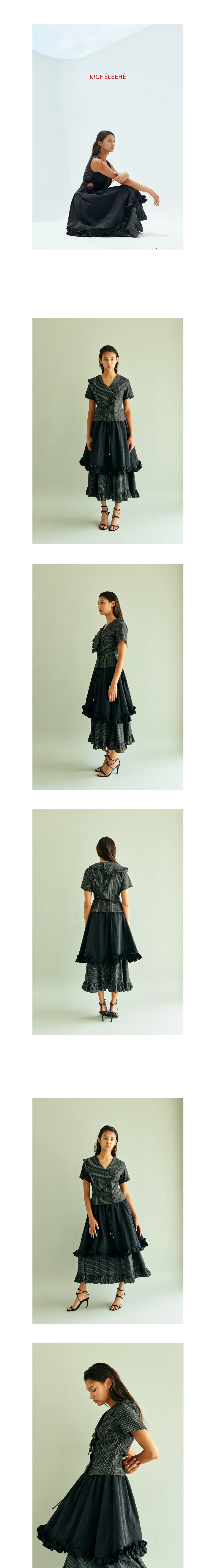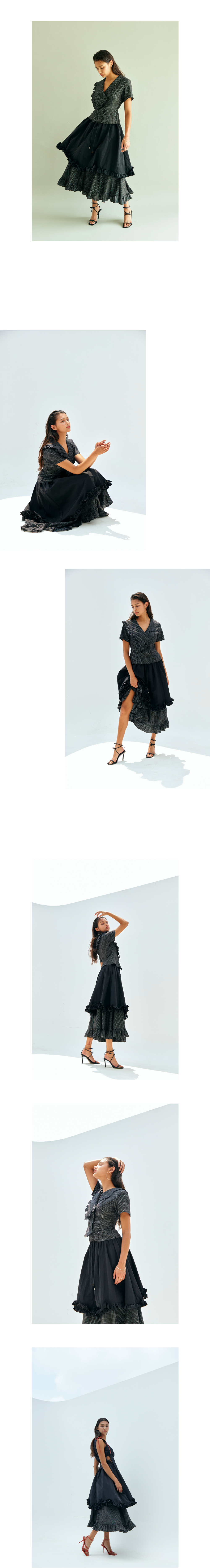 레이어드 스커트의 둥근 라인을 따라 사랑스러운 러플이 달려있는 디자인입니다.