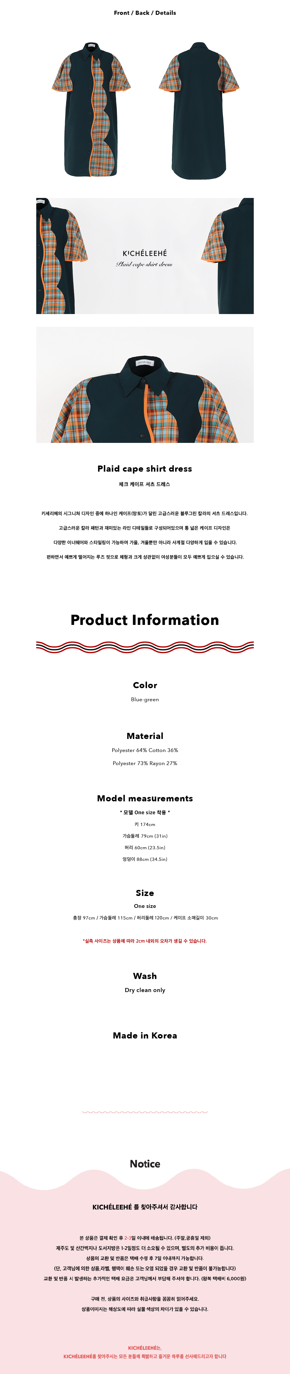 키셰리헤의 시그니쳐 디자인 중에 하나인 케이프(망토)가 달린 고급스러운 블루그린 칼라의 셔츠 드레스입니다.