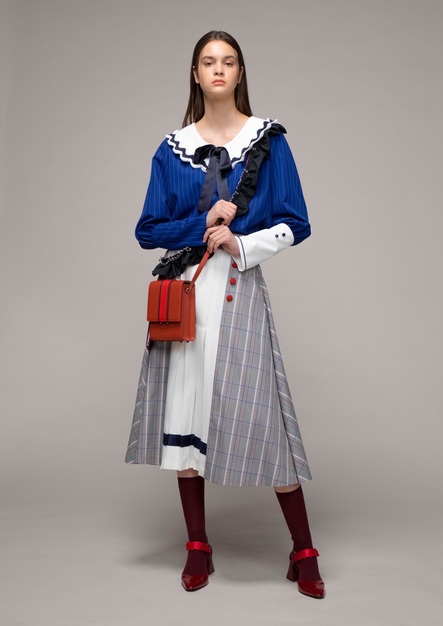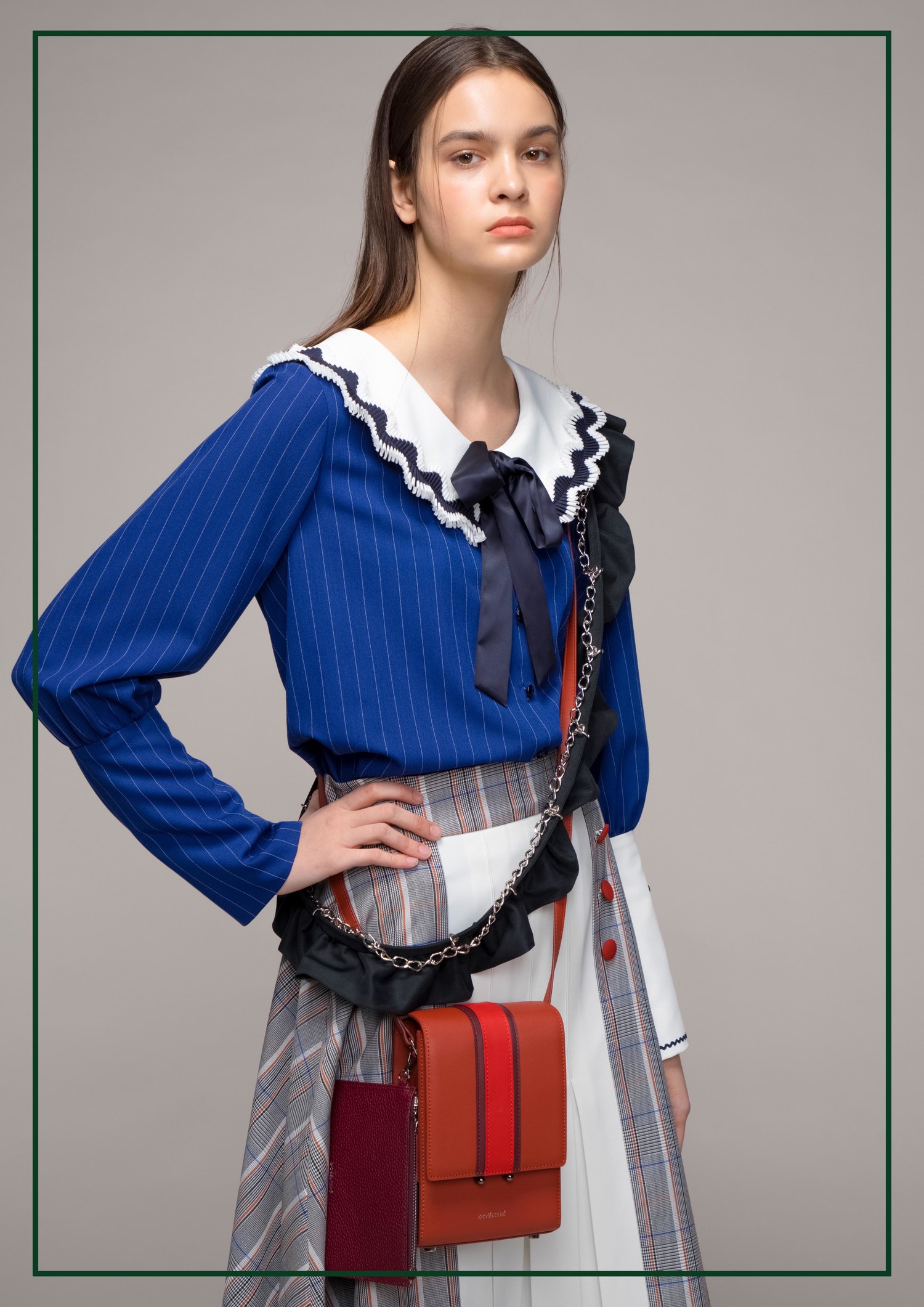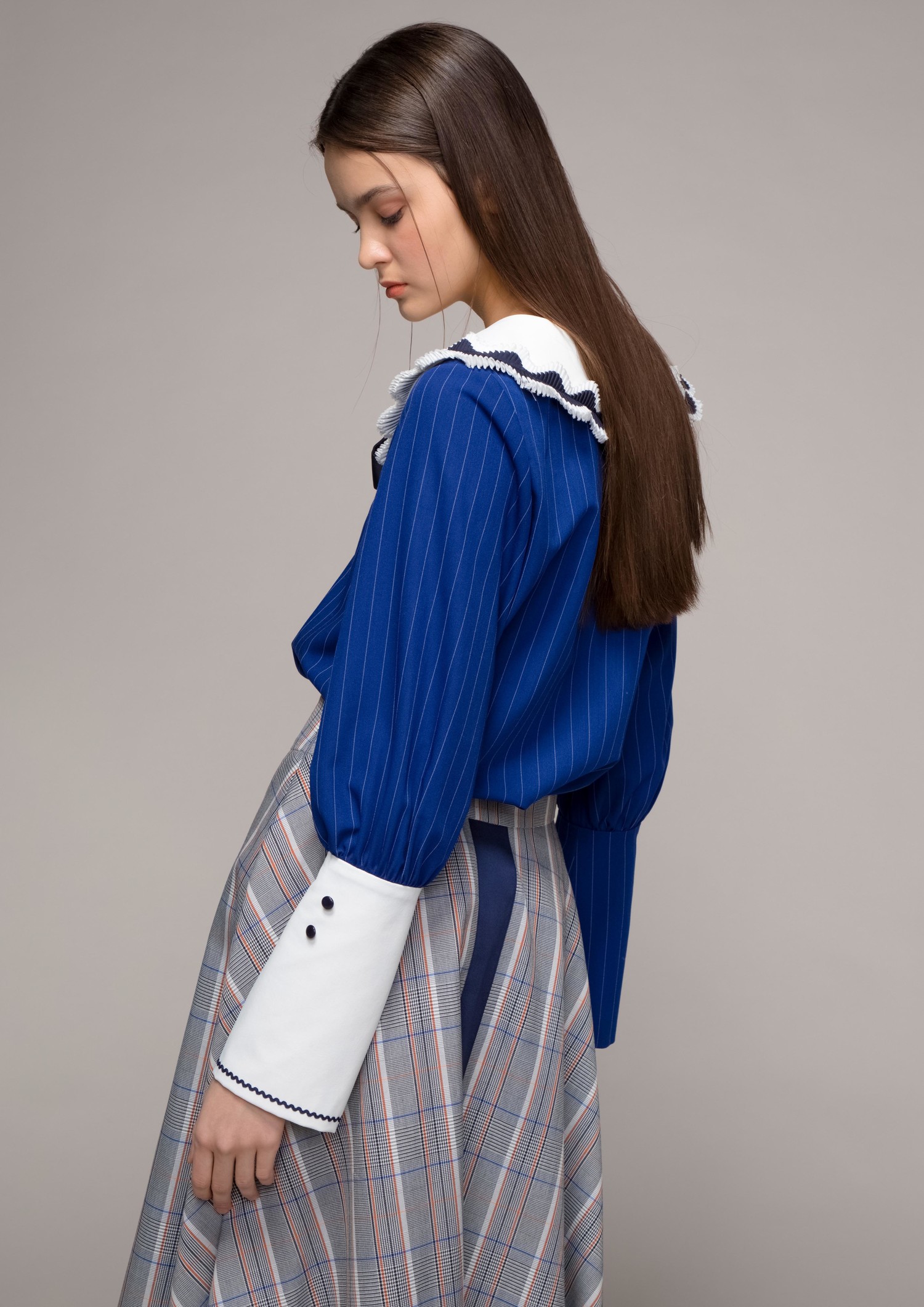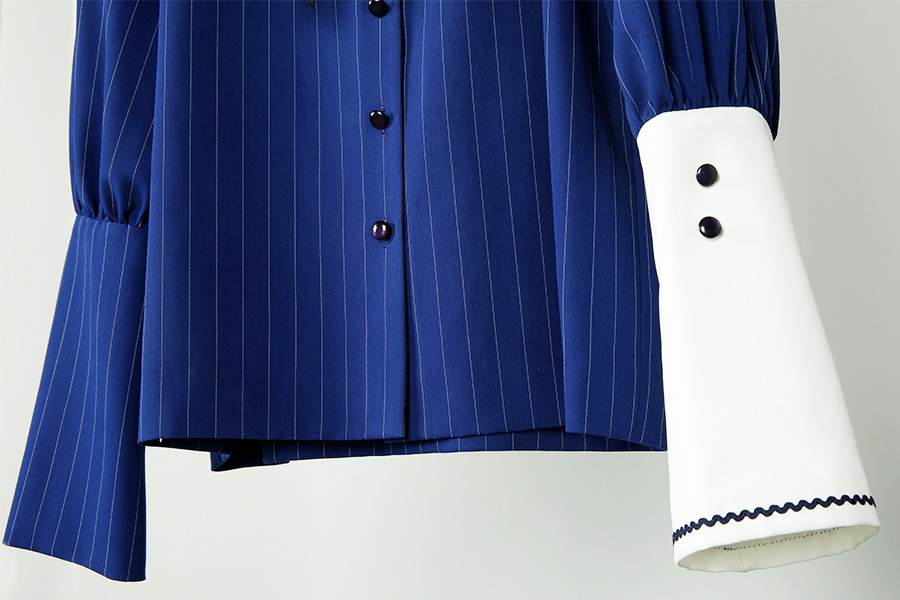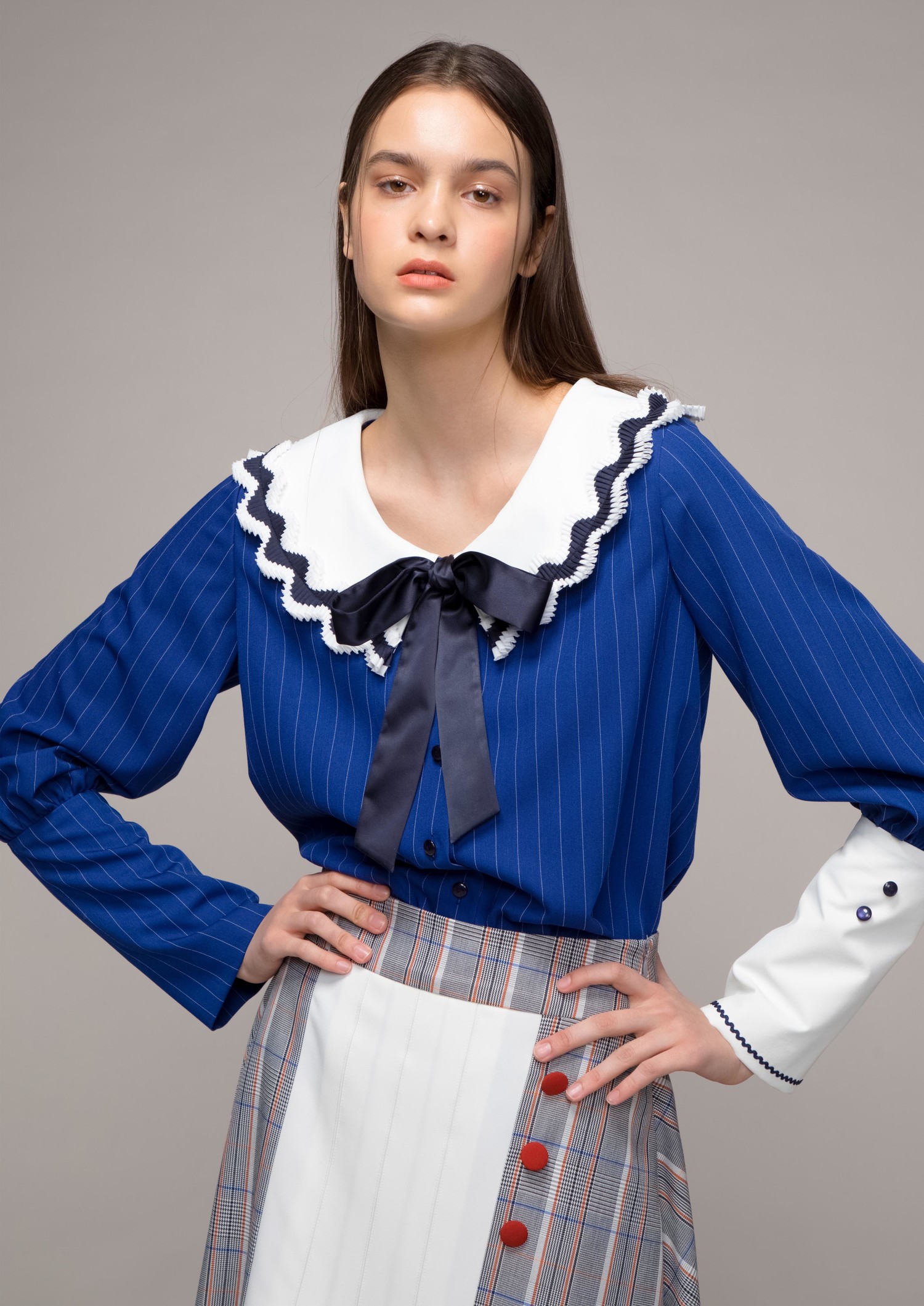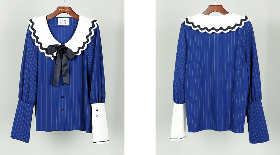 양 쪽 소매 배색이 다른 귀여운 주름 장식이 달린 카라 블라우스입니다.