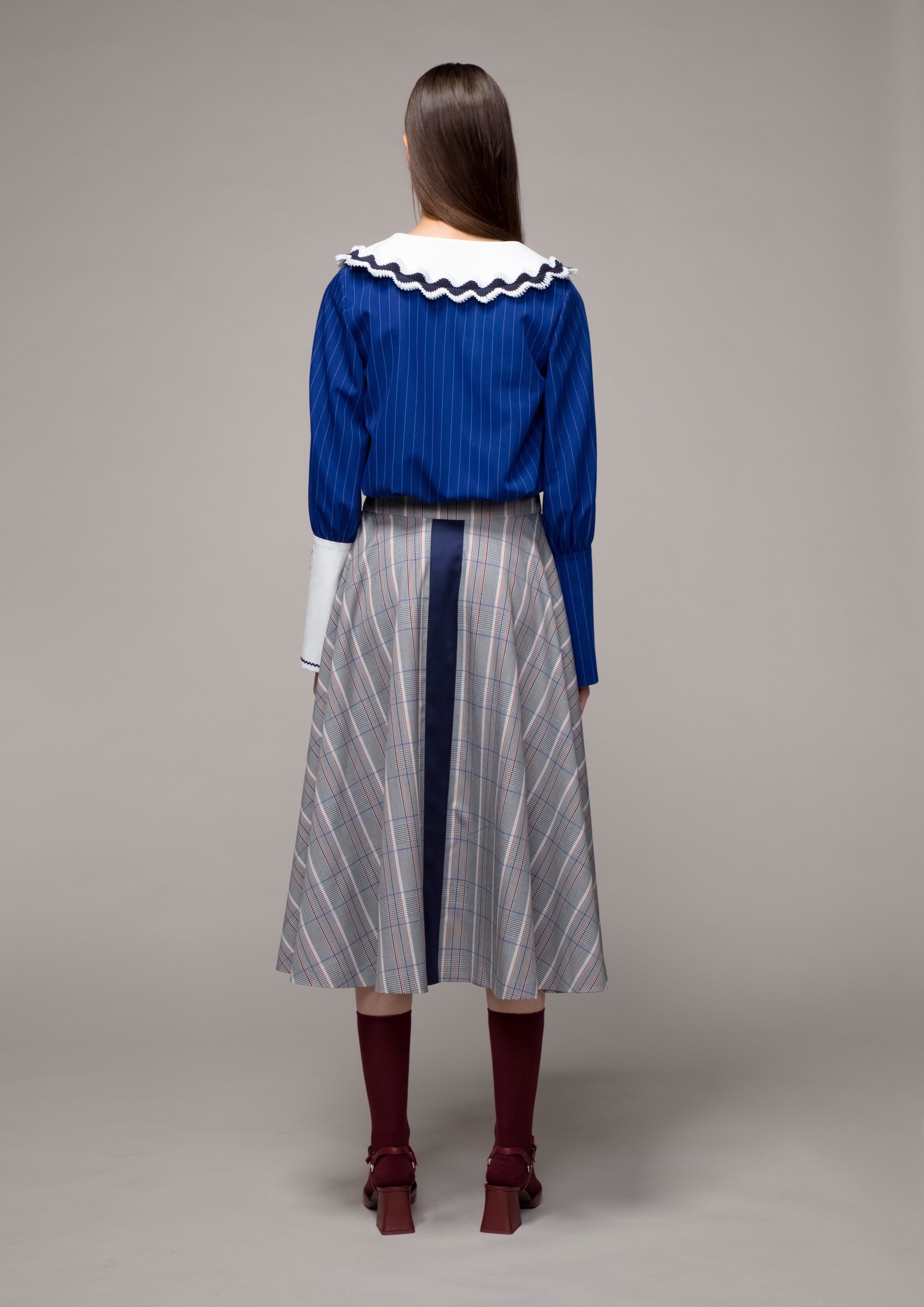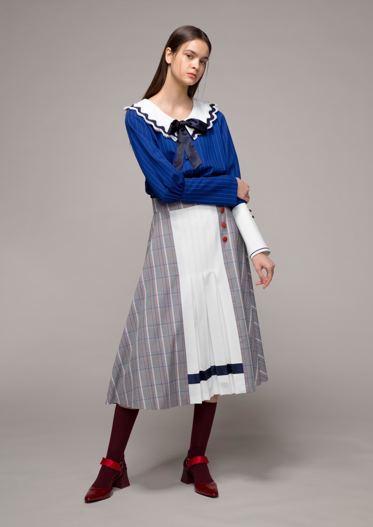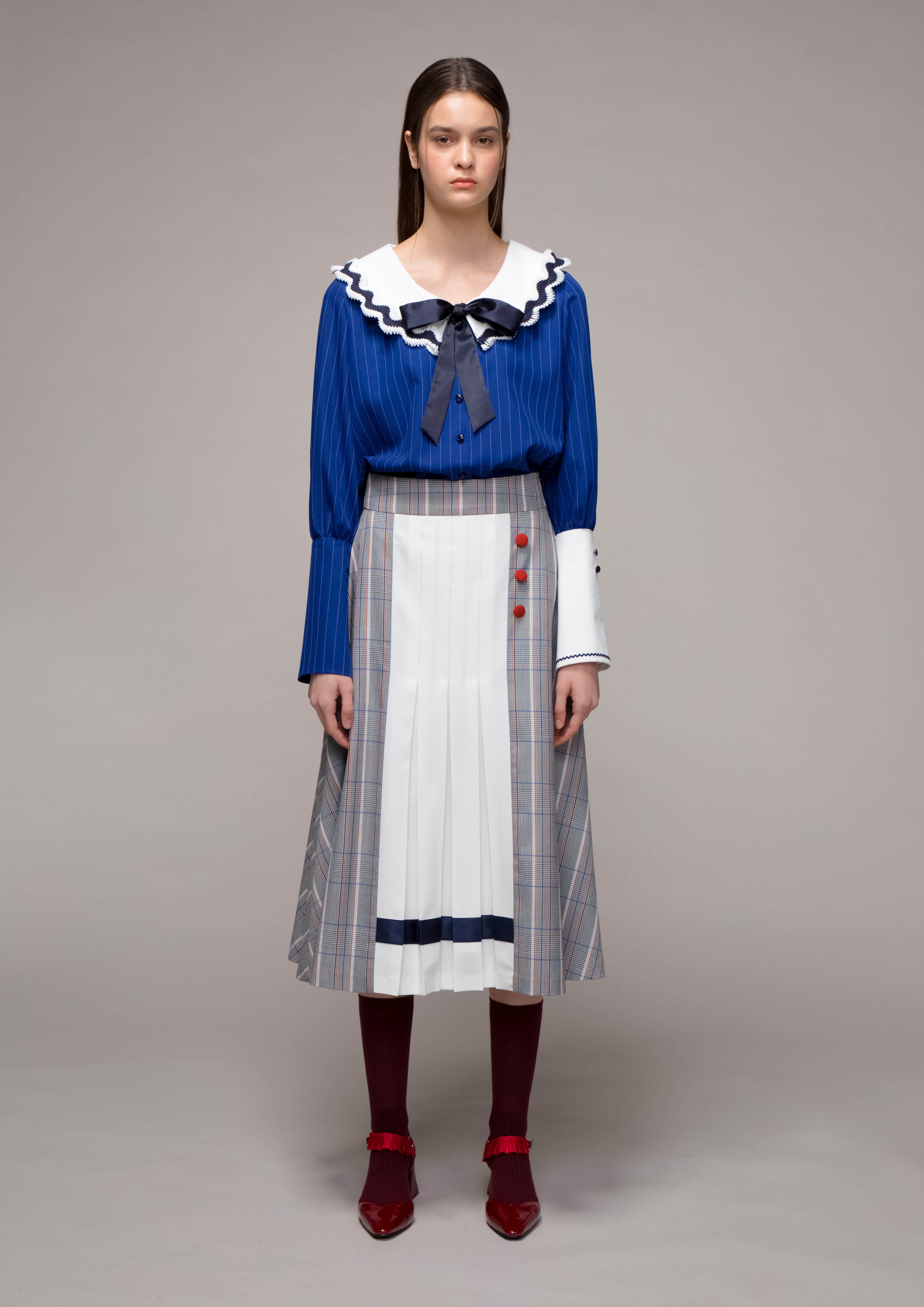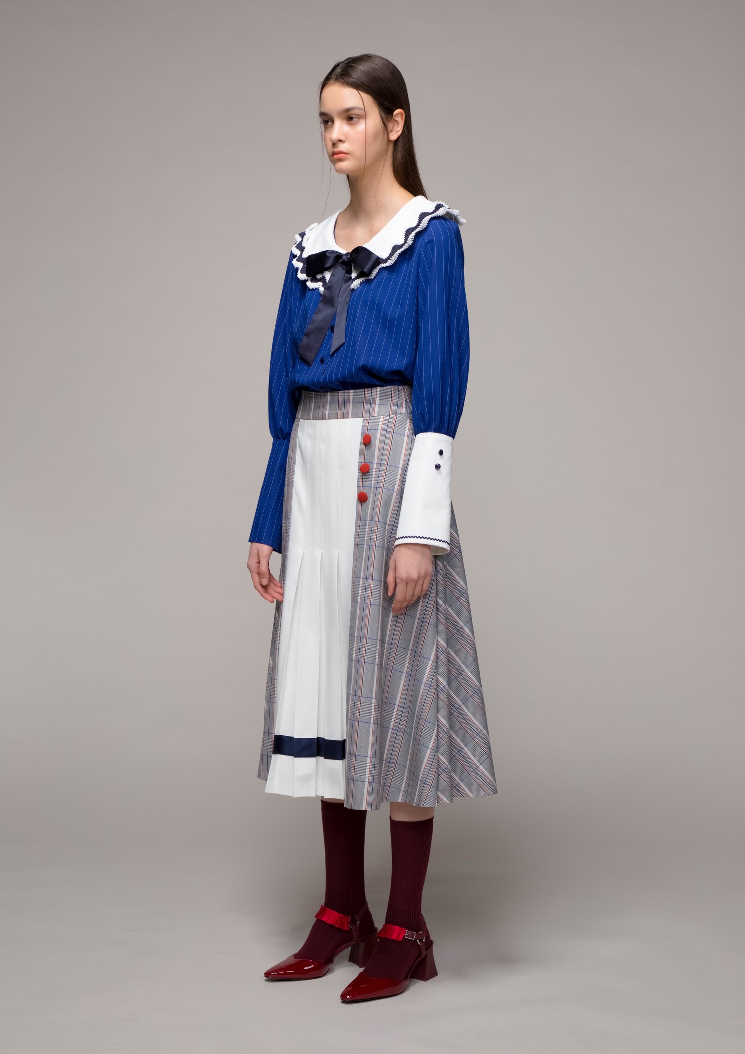 양 쪽 소매 배색이 다른 귀여운 주름 장식이 달린 카라 블라우스입니다.