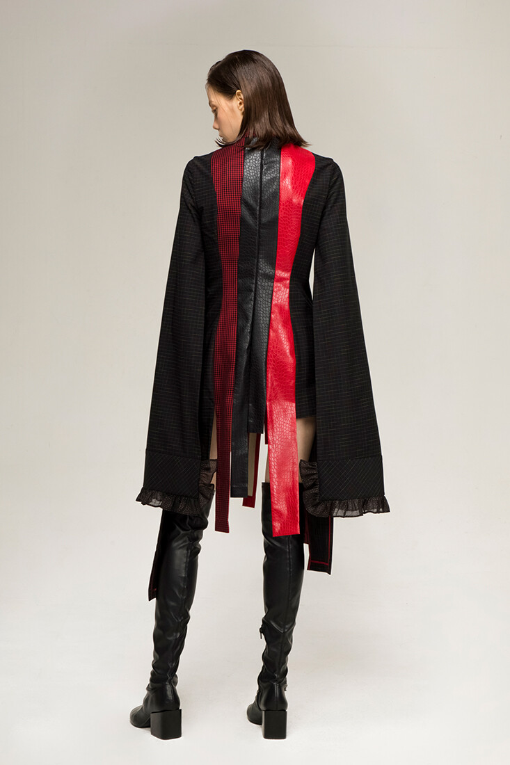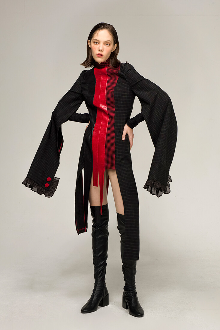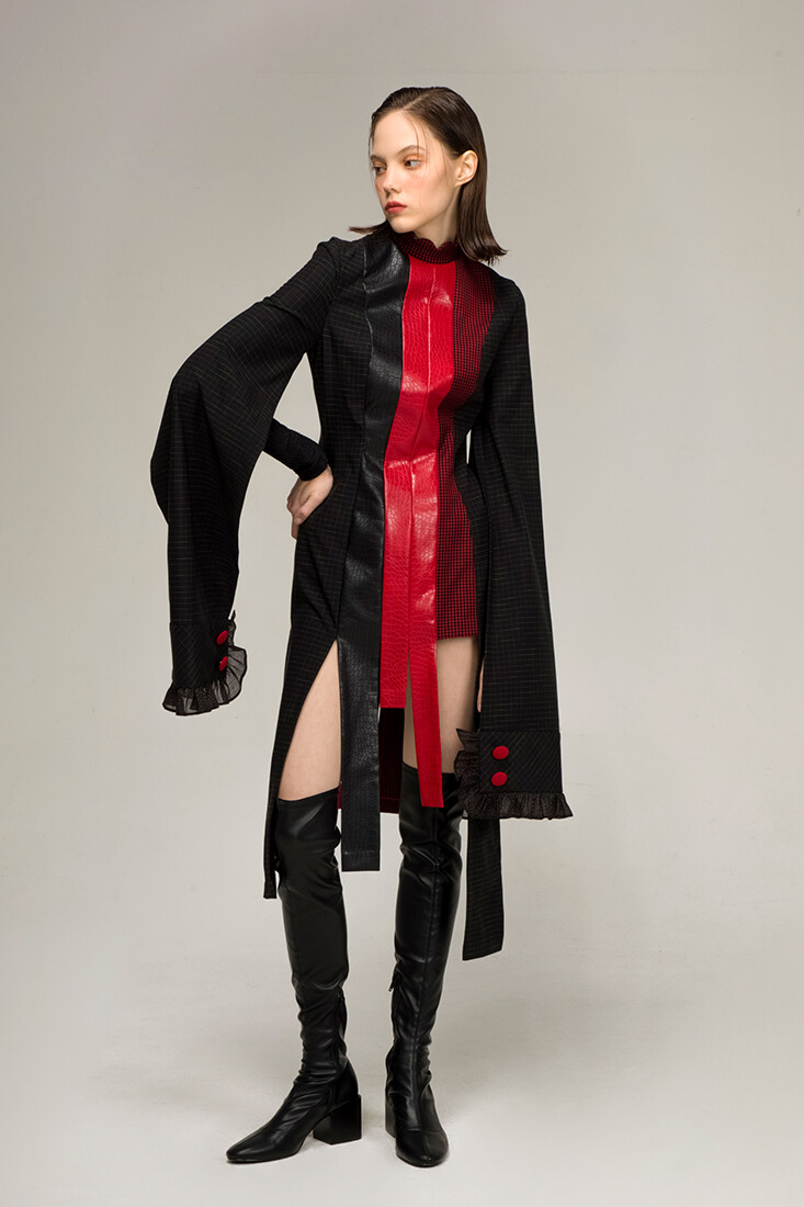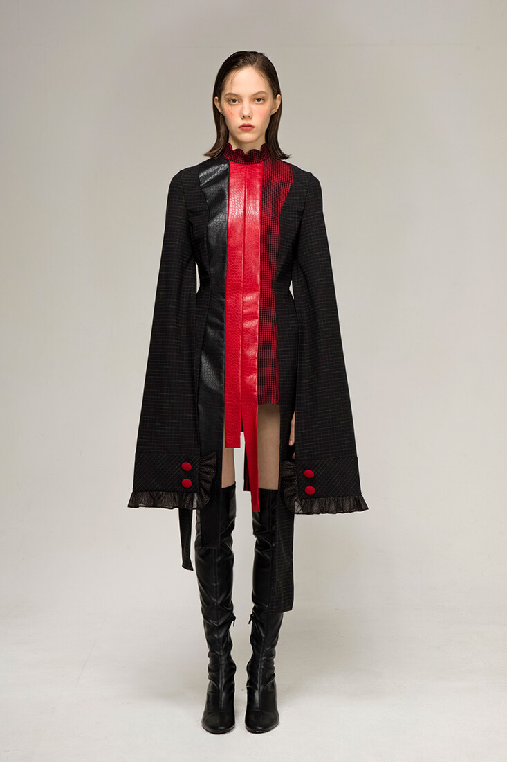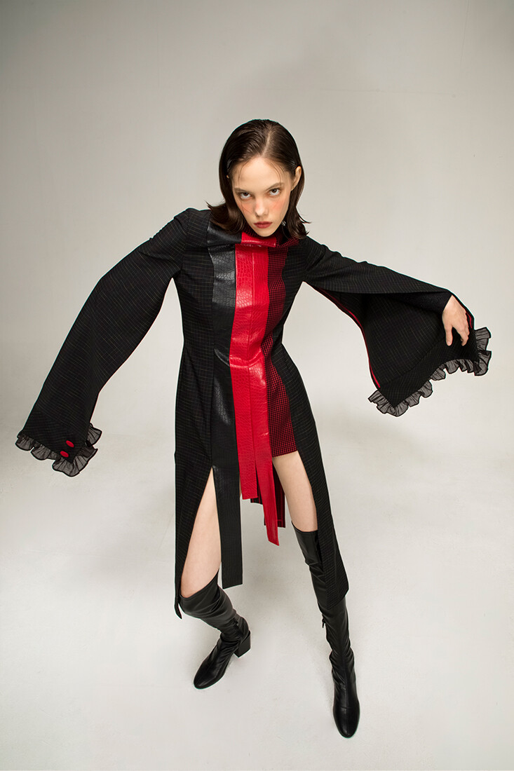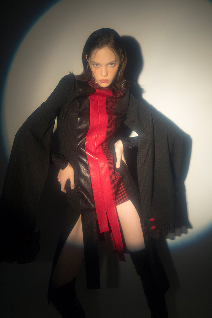 강인한 여기사 느낌의 강렬한 레드 배색, 가죽 사용과 언발란스한 트임들이 재미있는 디자인입니다.