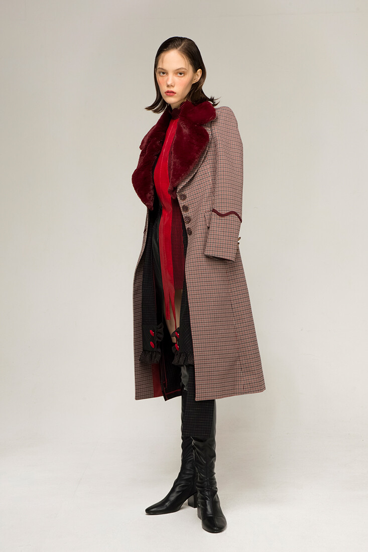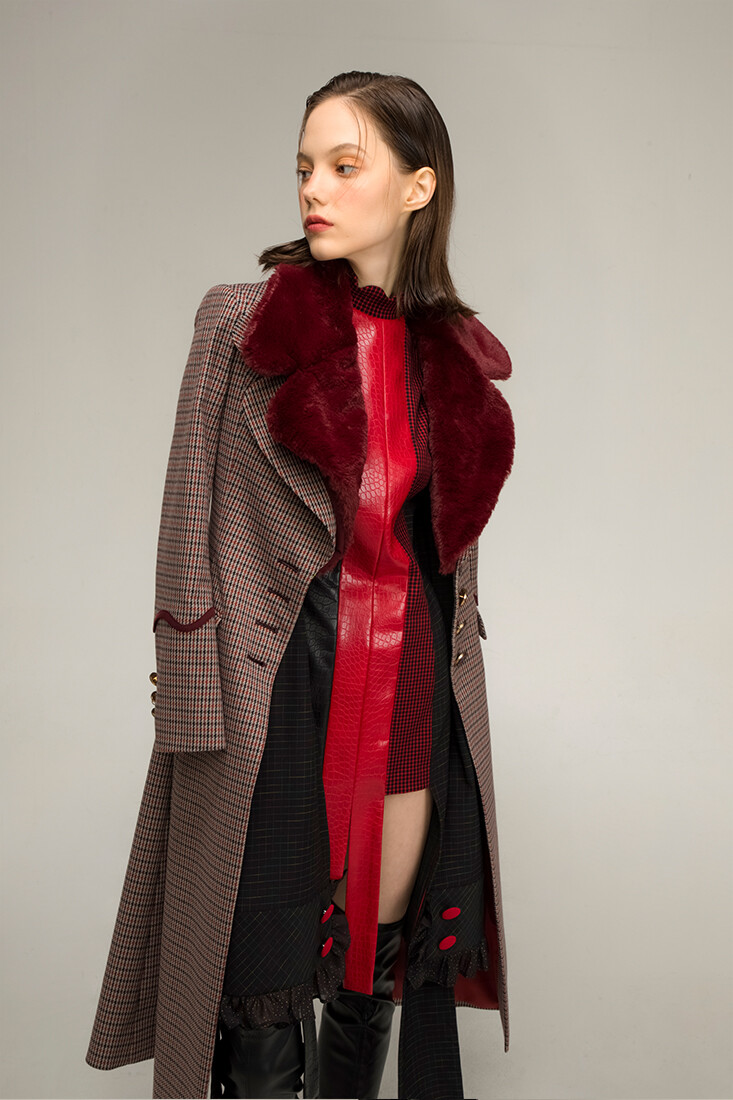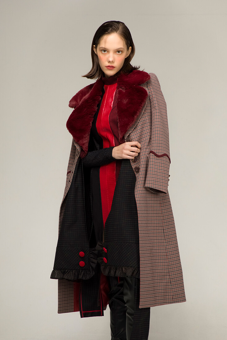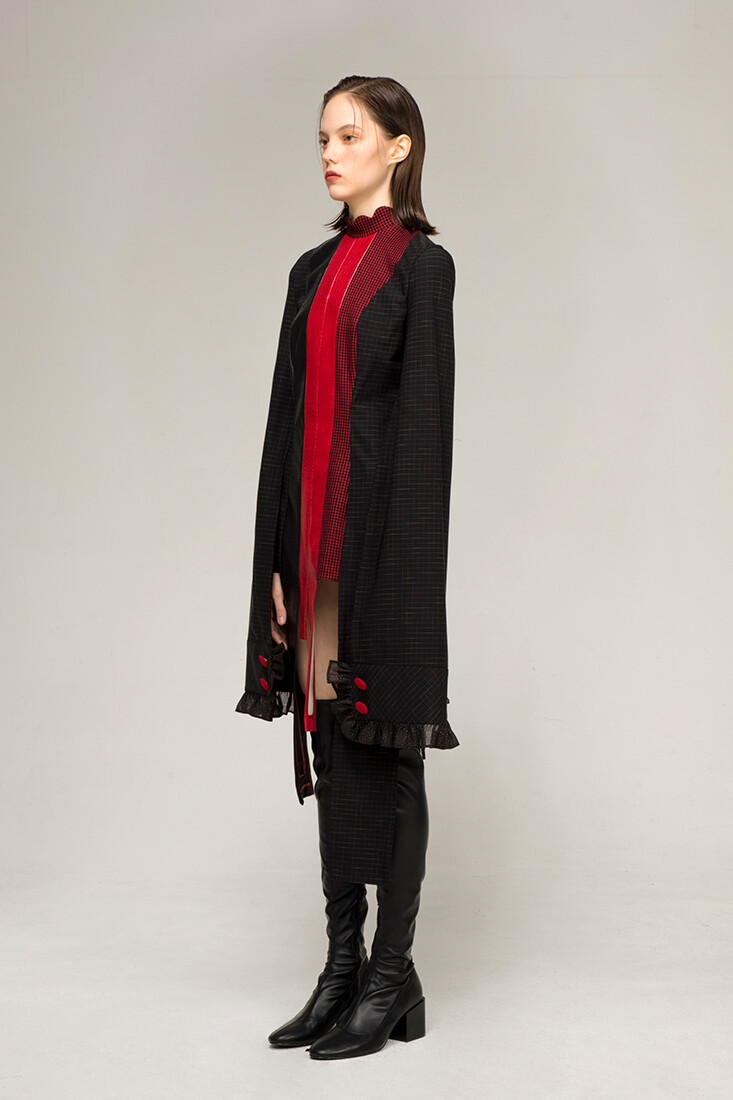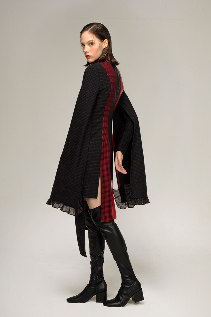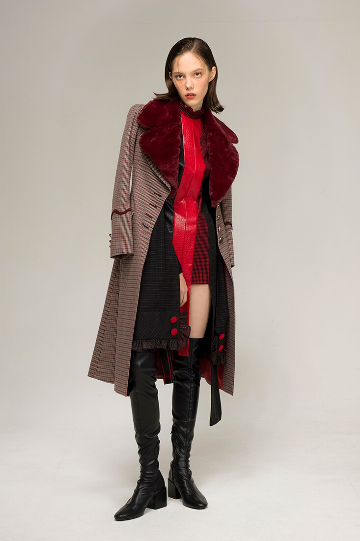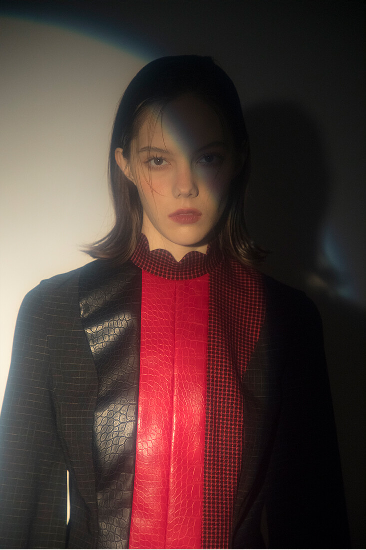 강인한 여기사 느낌의 강렬한 레드 배색, 가죽 사용과 언발란스한 트임들이 재미있는 디자인입니다.