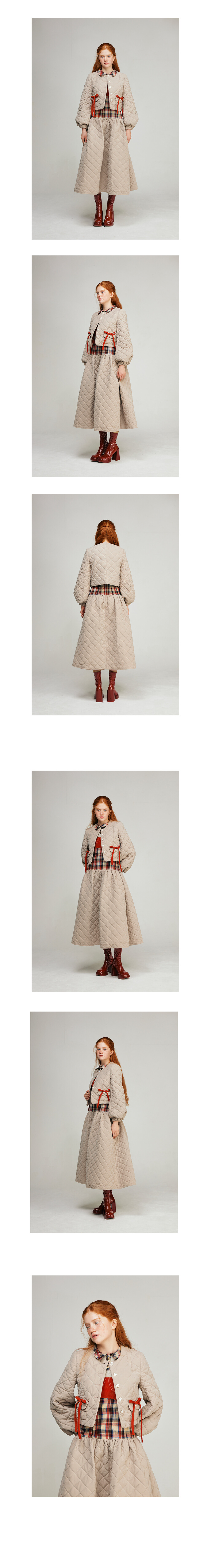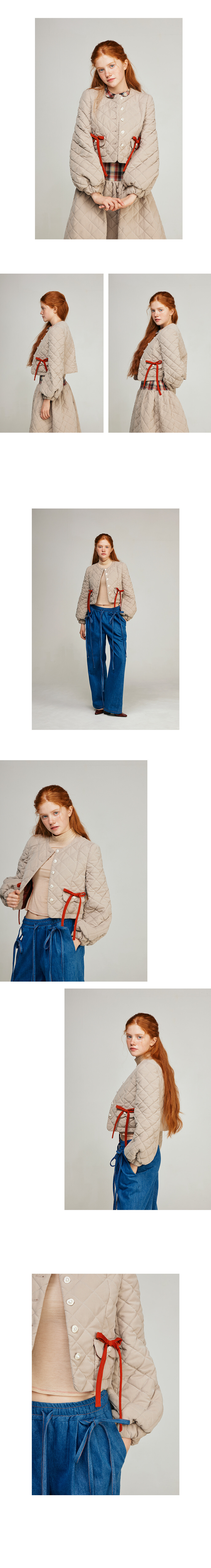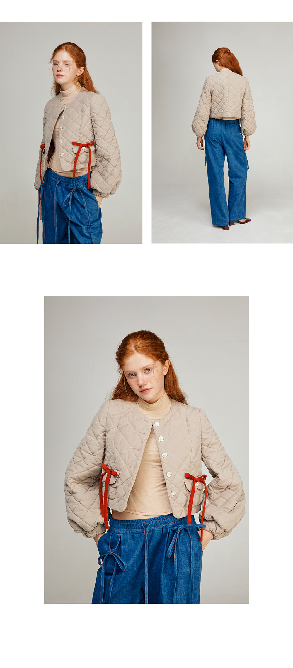 고급스러우면서도 키치한 포인트를 살려주는 퀼팅 원단을 사용하였고 손목 부분에 밴딩을 넣은 사랑스러운 벌룬 슬리브 디자인의 자켓입니다.