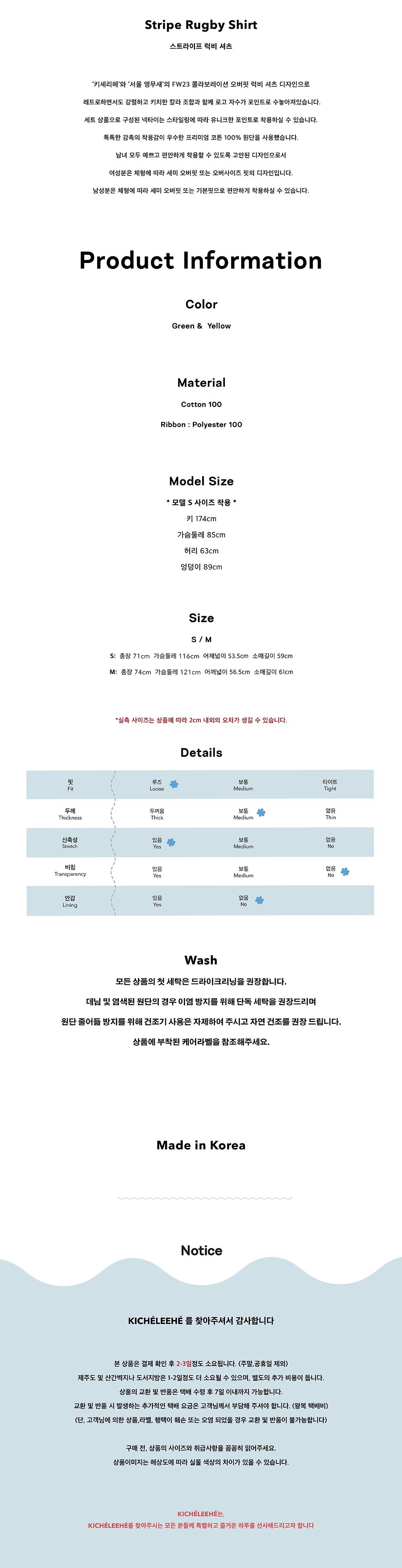 ‘키셰리헤’와 ‘서울 앵무새’의 FW23 콜라보레이션 오버핏 럭비 셔츠 디자인으로 레트로하면서도 강렬하고 키치한 칼라 조합과 함께 로고 자수가 포인트로 수놓아져있습니다. 세트 상품으로 구성된 넥타이는 스타일링에 따라 유니크한 포인트로 착용하실 수 있습니다. 톡톡한 감촉의 착용감이 우수한 프리미엄 코튼 100% 원단을 사용했습니다. 남녀 모두 예쁘고 편안하게 착용할 수 있도록 고안된 디자인으로서 여성분은 체형에 따라 세미 오버핏 또는 오버사이즈 핏의 디자인입니다. 남성분은 체형에 따라 세미 오버핏 또는 기본핏으로 편안하게 착용하실 수 있습니다.