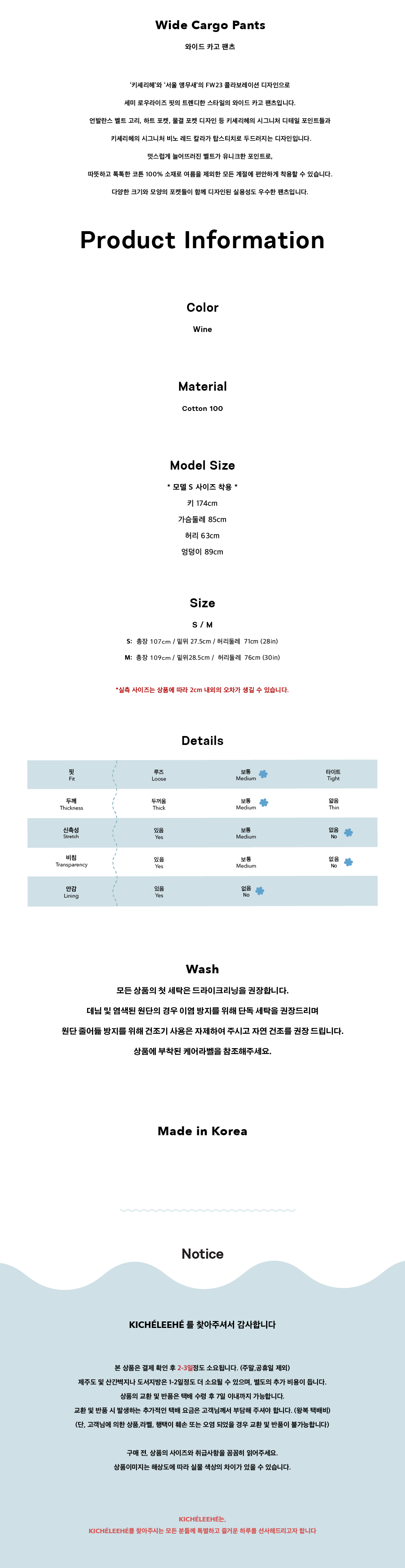 ‘키셰리헤’와 ‘서울 앵무새’의 FW23 콜라보레이션 디자인으로 세미 로우라이즈 핏의 트렌디한 스타일의 와이드 카고 팬츠입니다.