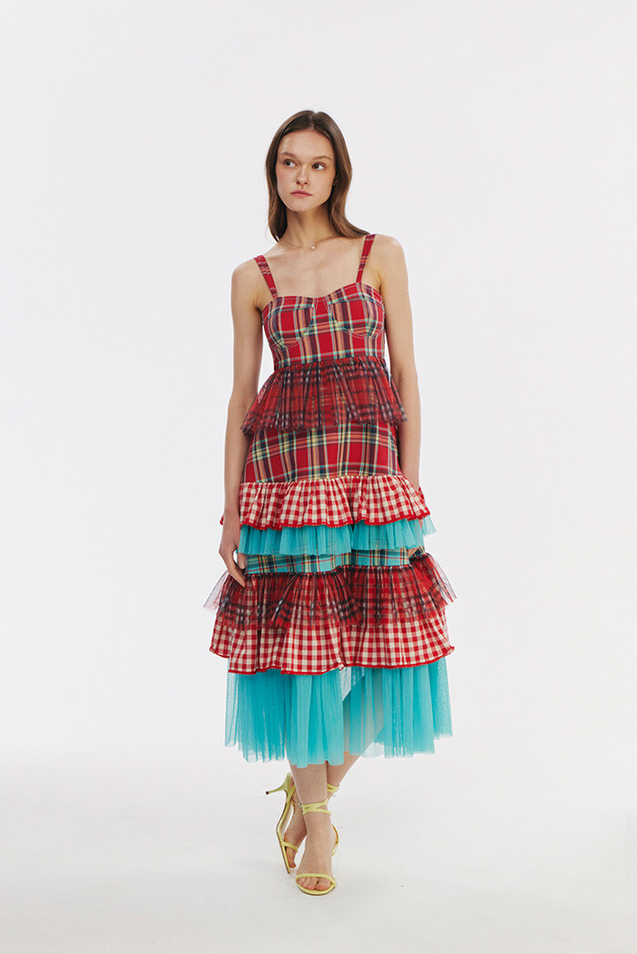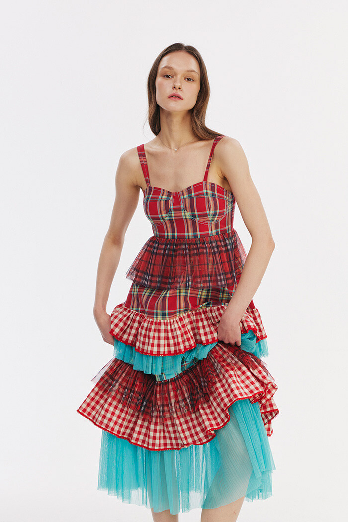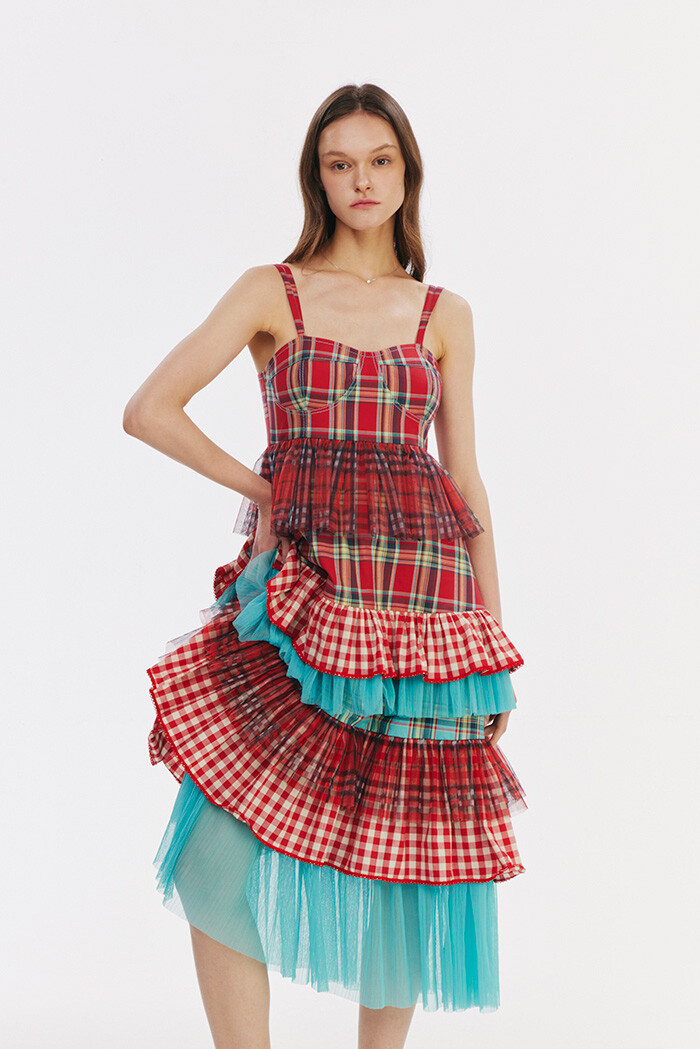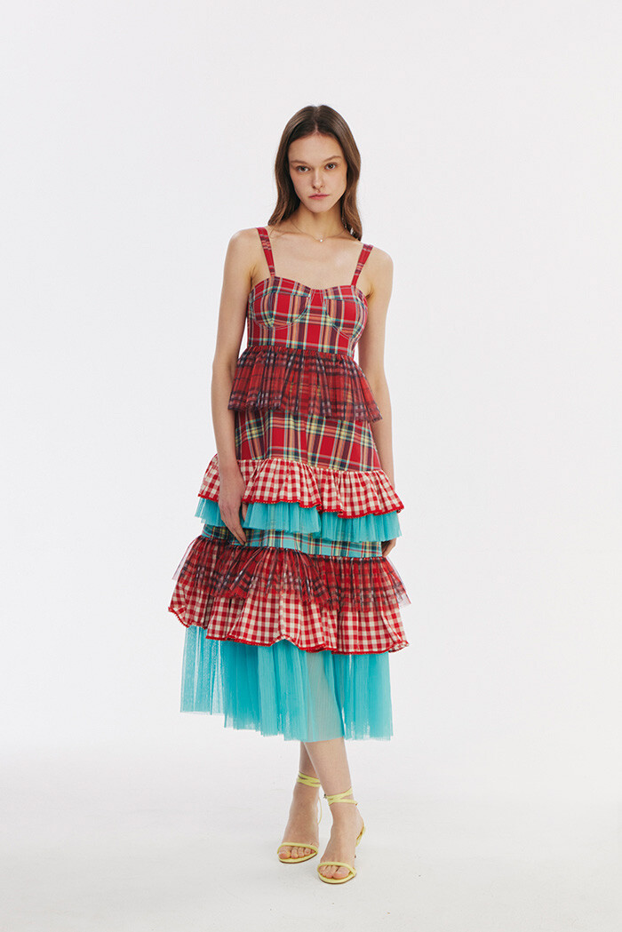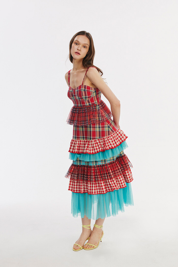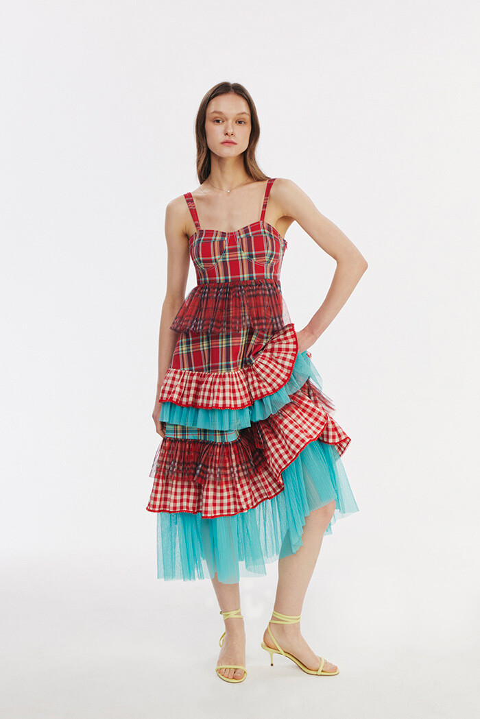 키치한 느낌의 체크 코튼원단과 함께 풍성한 셔링 스커트로 이루어진 맥시 드레스 디자인으로 다양한 배색들이 조화롭게 이루어진 레어어드 드레스입니다.