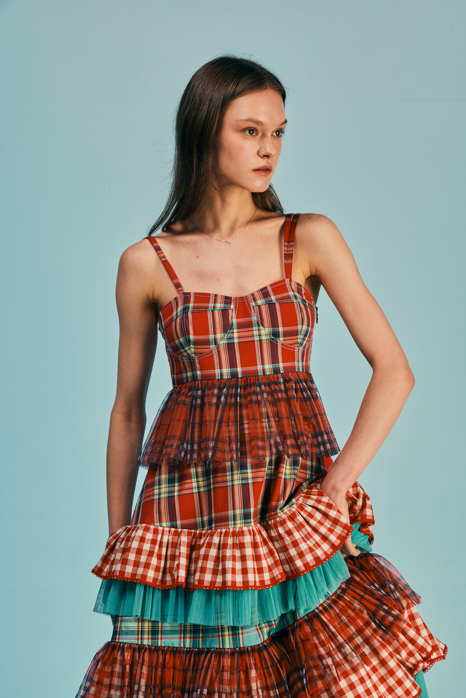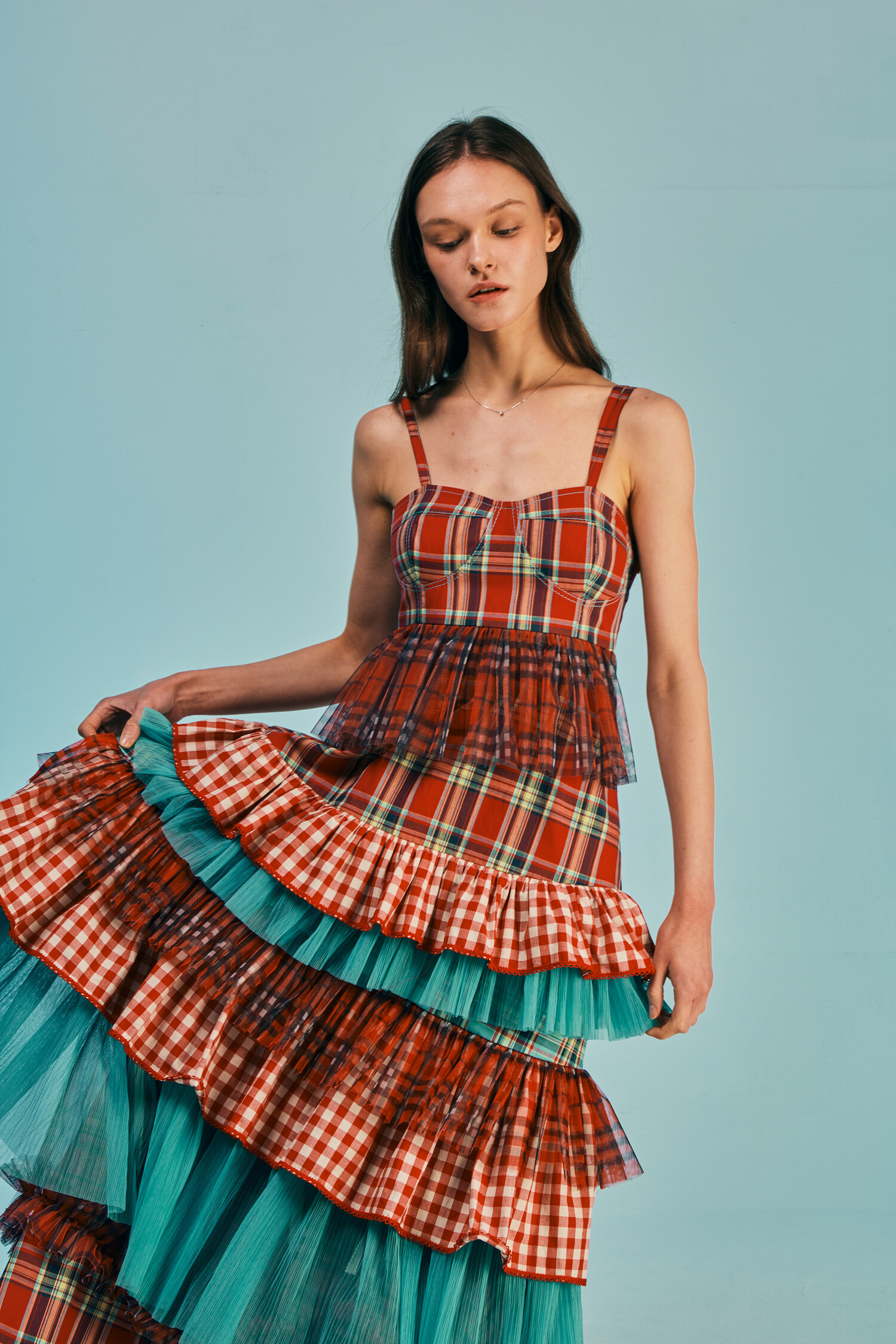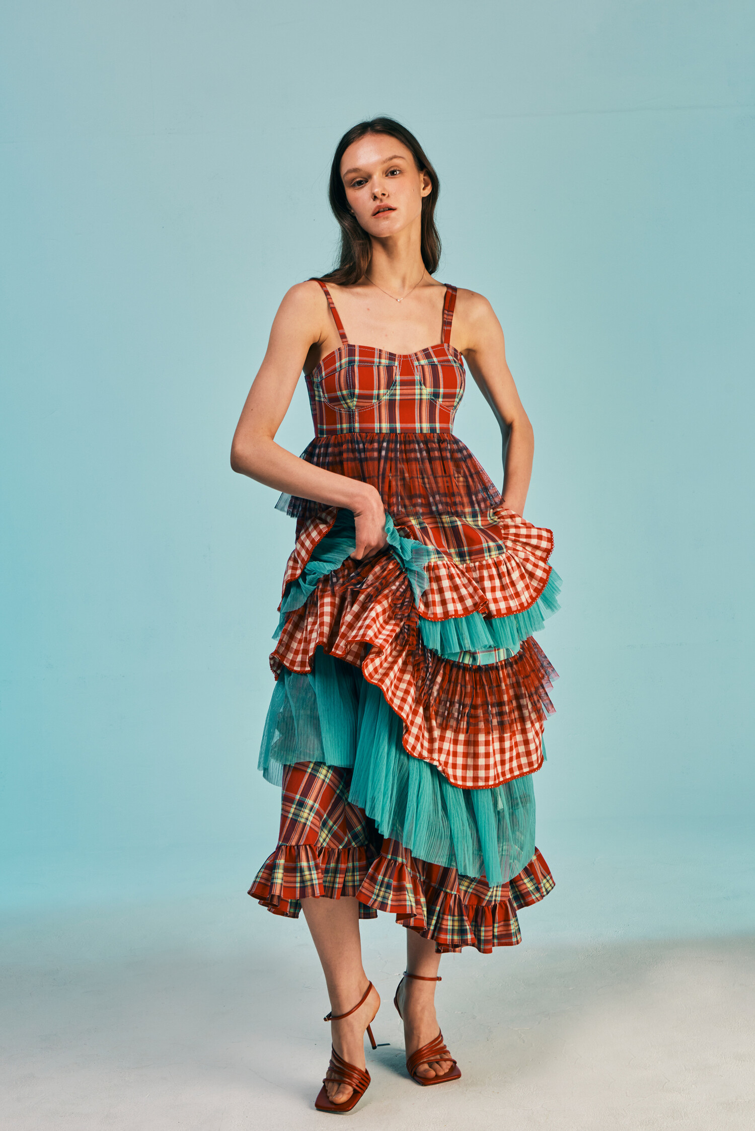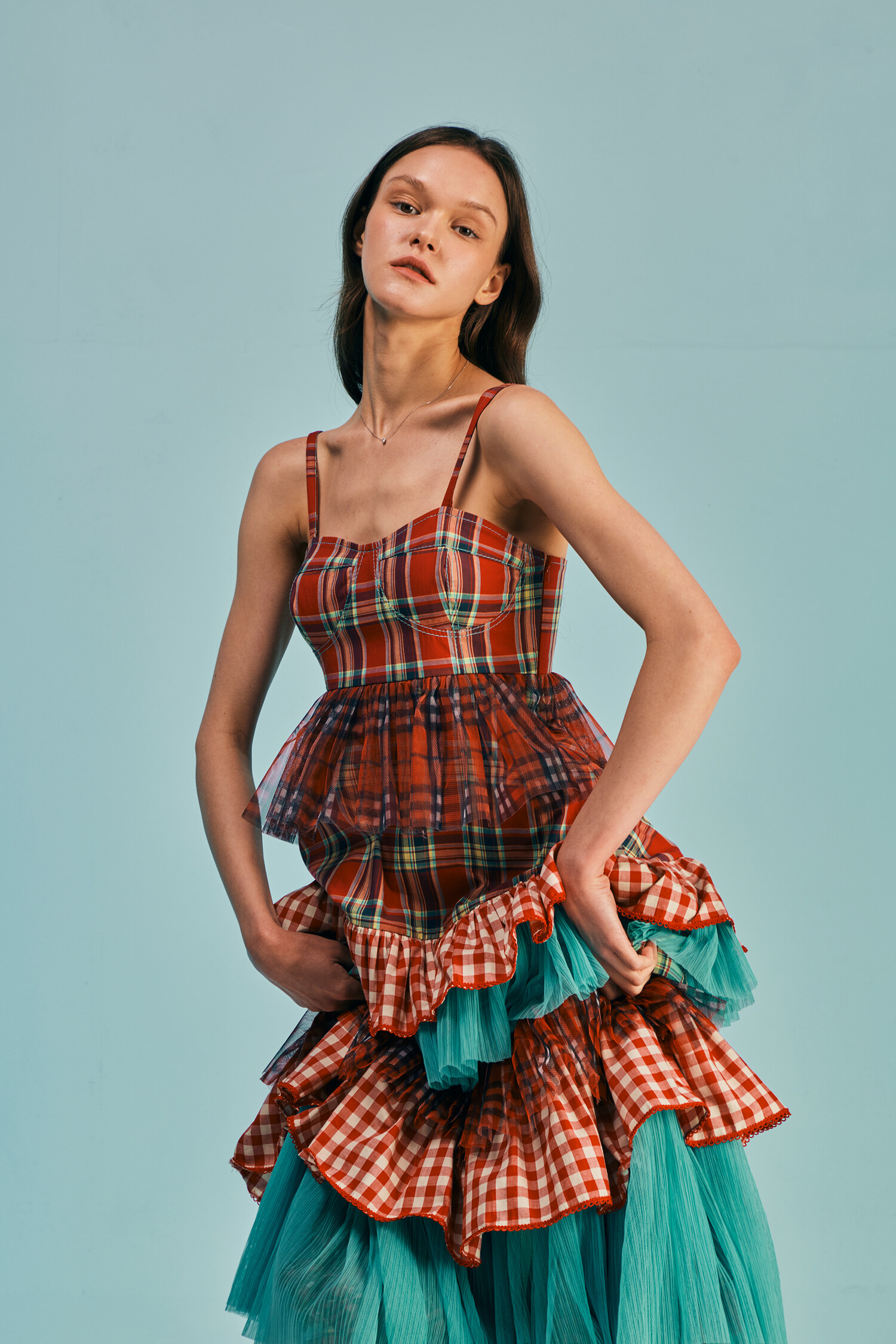 키치한 느낌의 체크 코튼원단과 함께 풍성한 셔링 스커트로 이루어진 맥시 드레스 디자인으로 다양한 배색들이 조화롭게 이루어진 레어어드 드레스입니다.