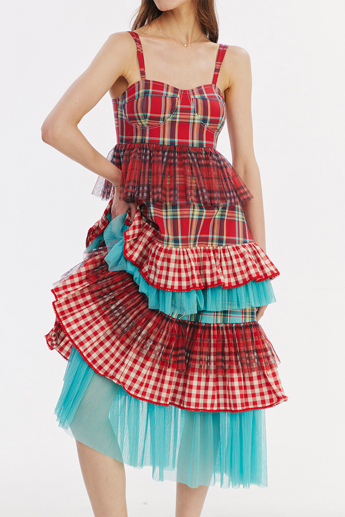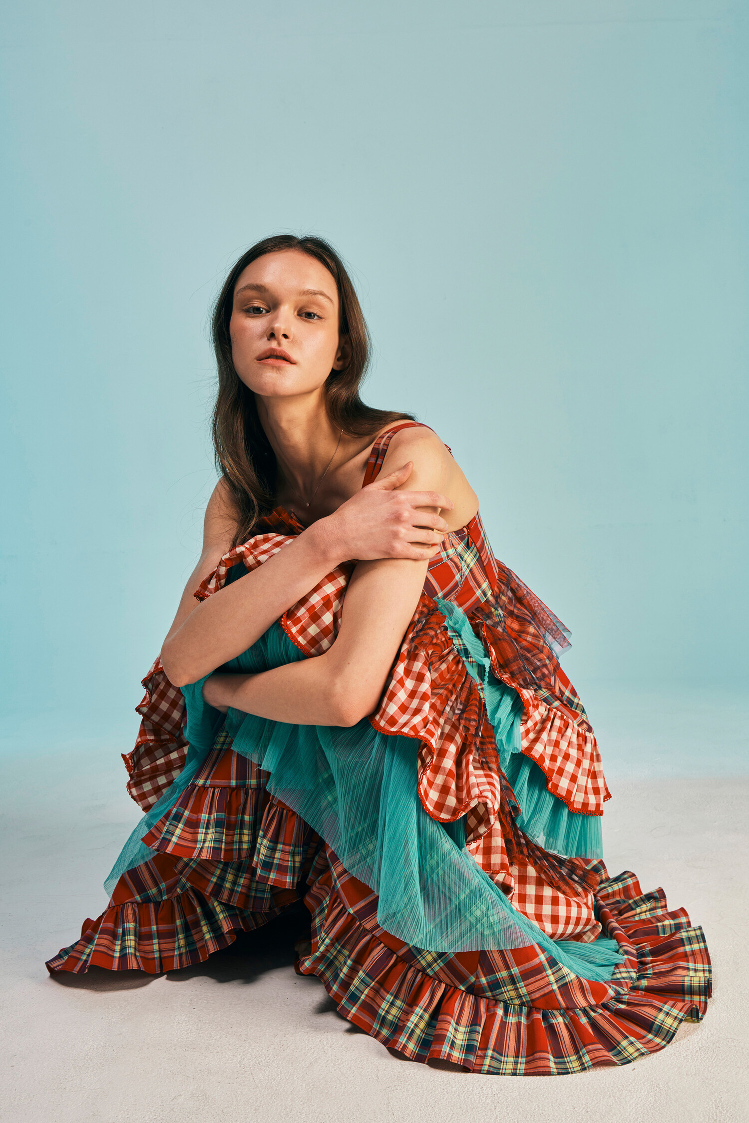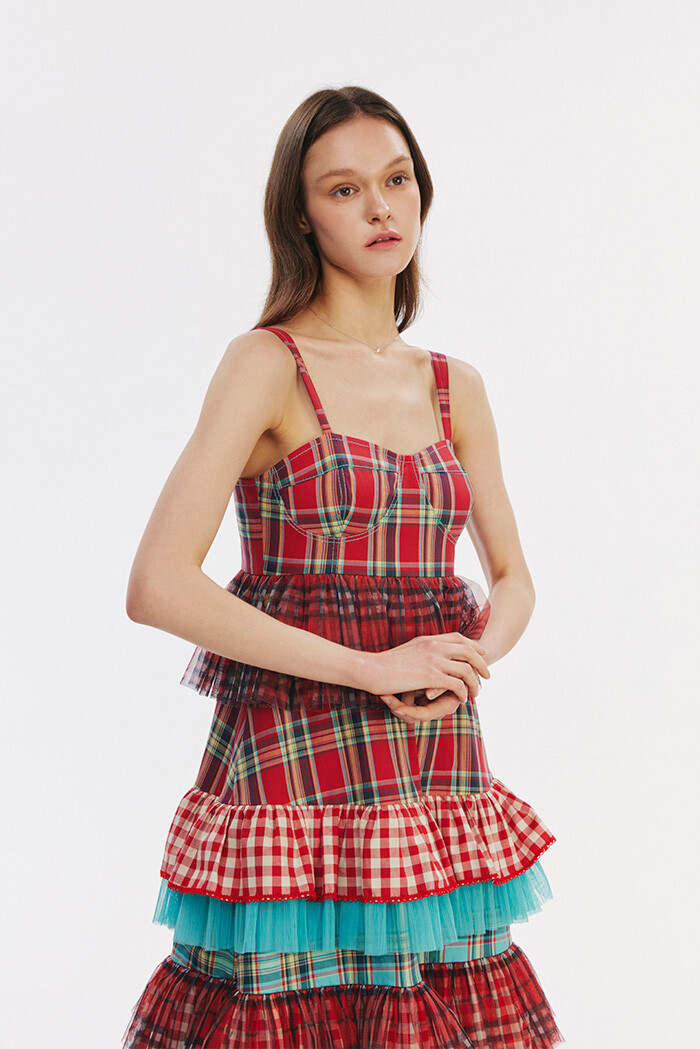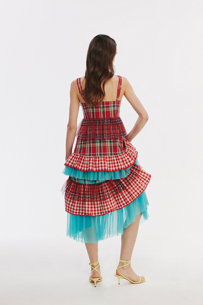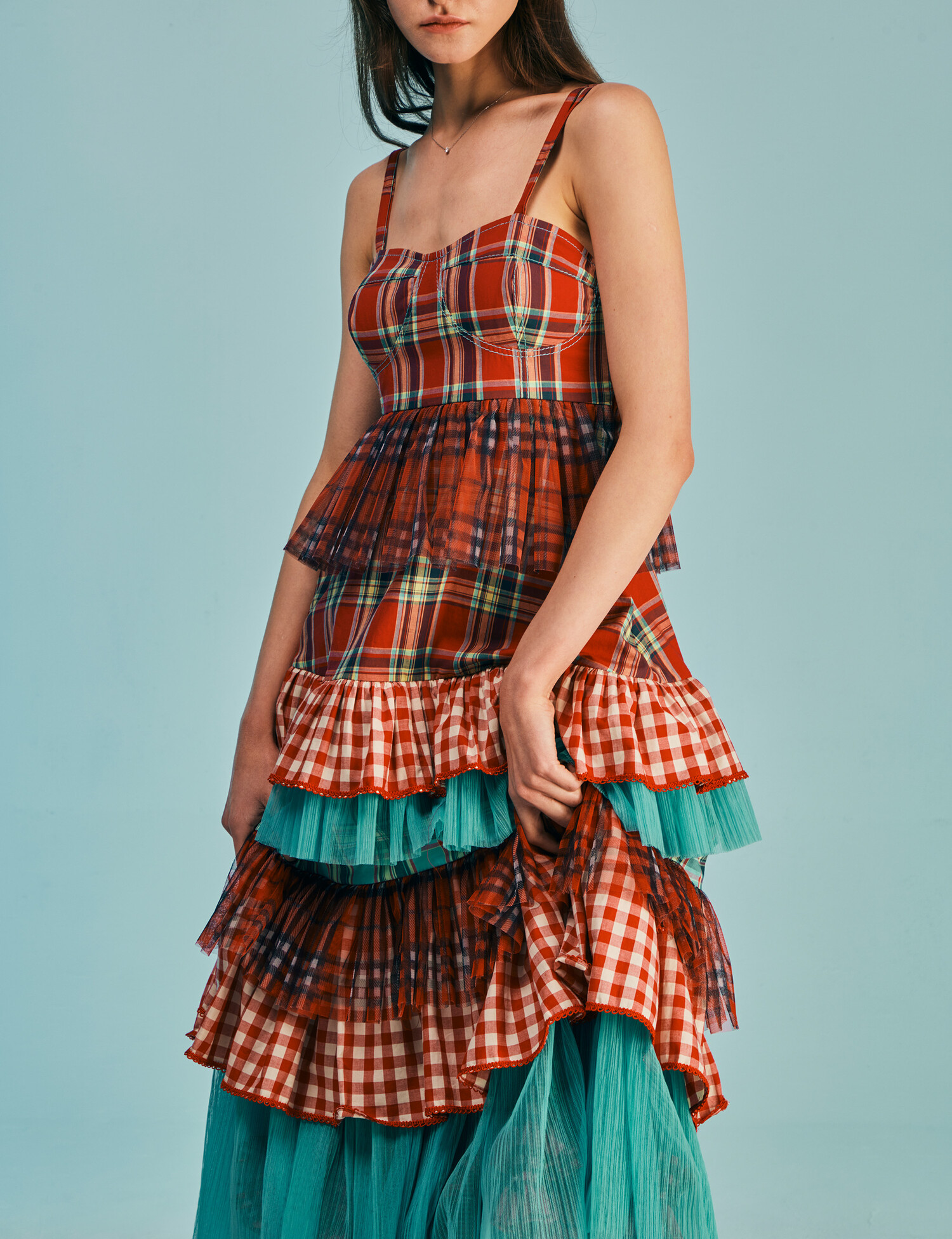 키치한 느낌의 체크 코튼원단과 함께 풍성한 셔링 스커트로 이루어진 맥시 드레스 디자인으로 다양한 배색들이 조화롭게 이루어진 레어어드 드레스입니다.